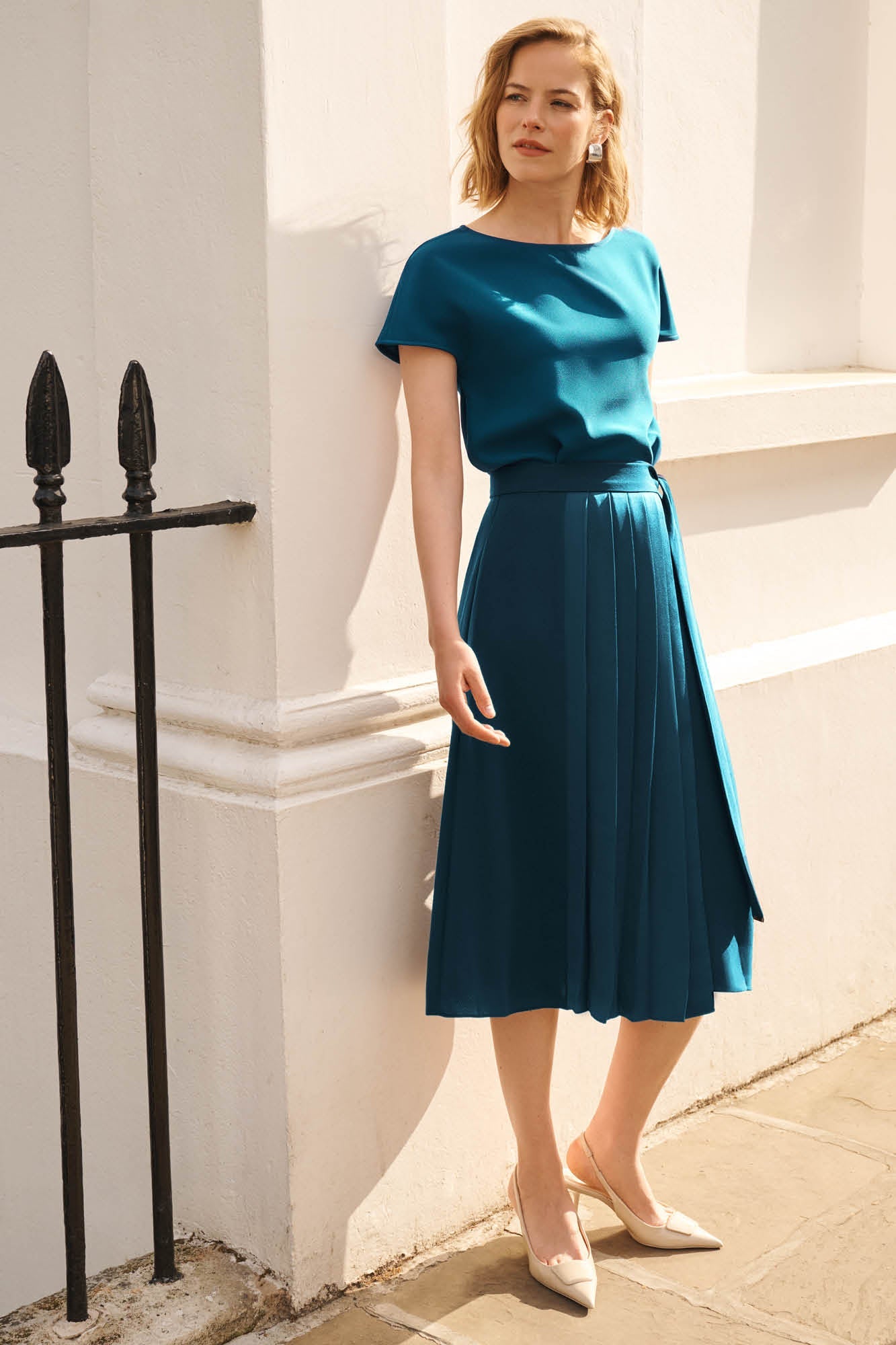 Elevate your everyday with Stanhope, This pleated wrap skirt is crafted in our signature satin back crepe that’s ultra-comfortable to move in. The pleated front is cut in the contrast satin to add a luxurious touch with gold details at the end of the tie belt. Designed to flatter the figure, the skirt finishes just below the knee and has buttons on the inside of the skirt to safely secure the wrap. Don with a neutral tee and let the skirt speak for itself or go for full-on impact by teaming with the matching Sullivan Top.