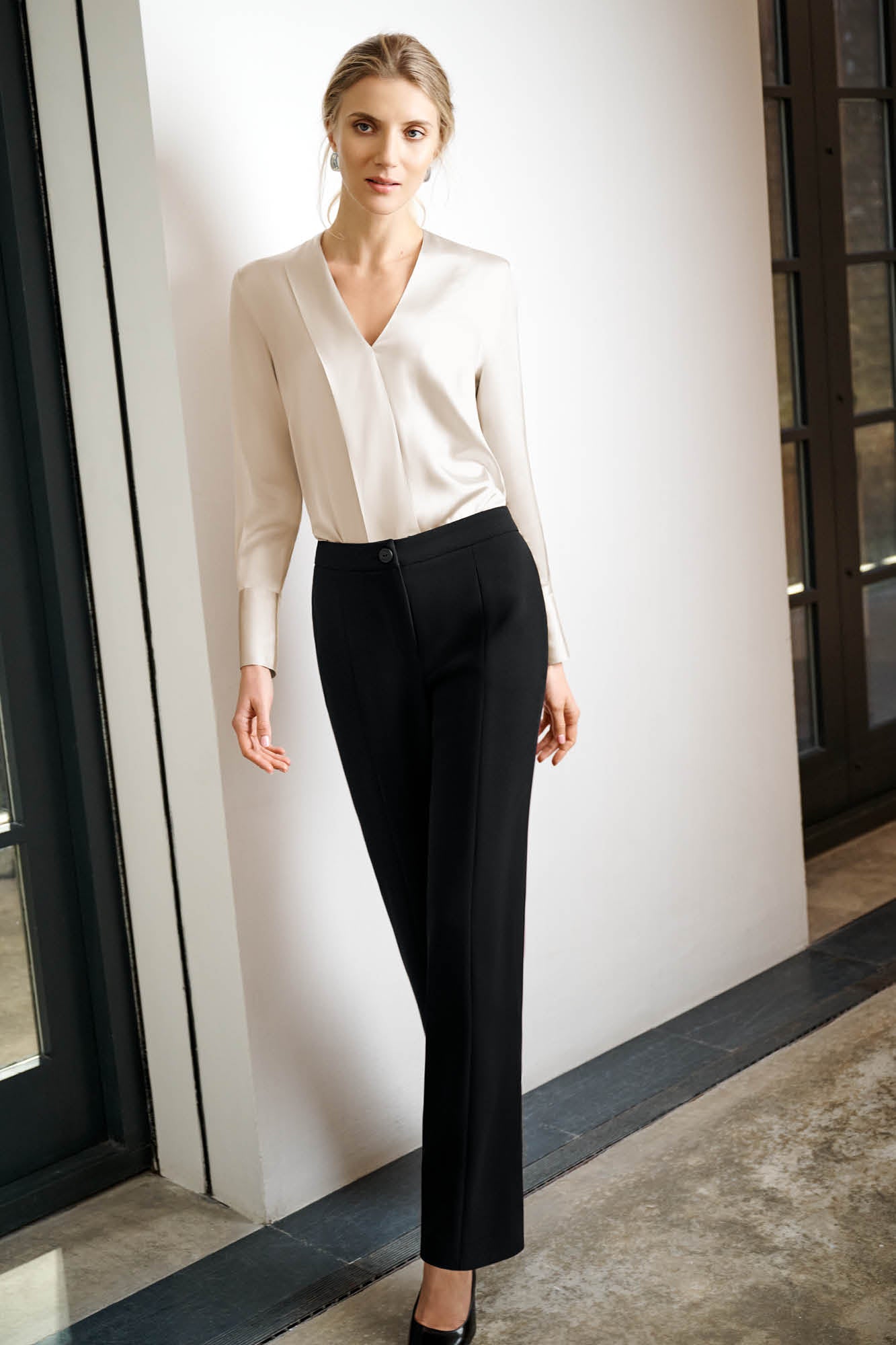 Model wears with our Brompton Jacket in Black Performance Tailoring and our Ravello Blouse in Oyster.