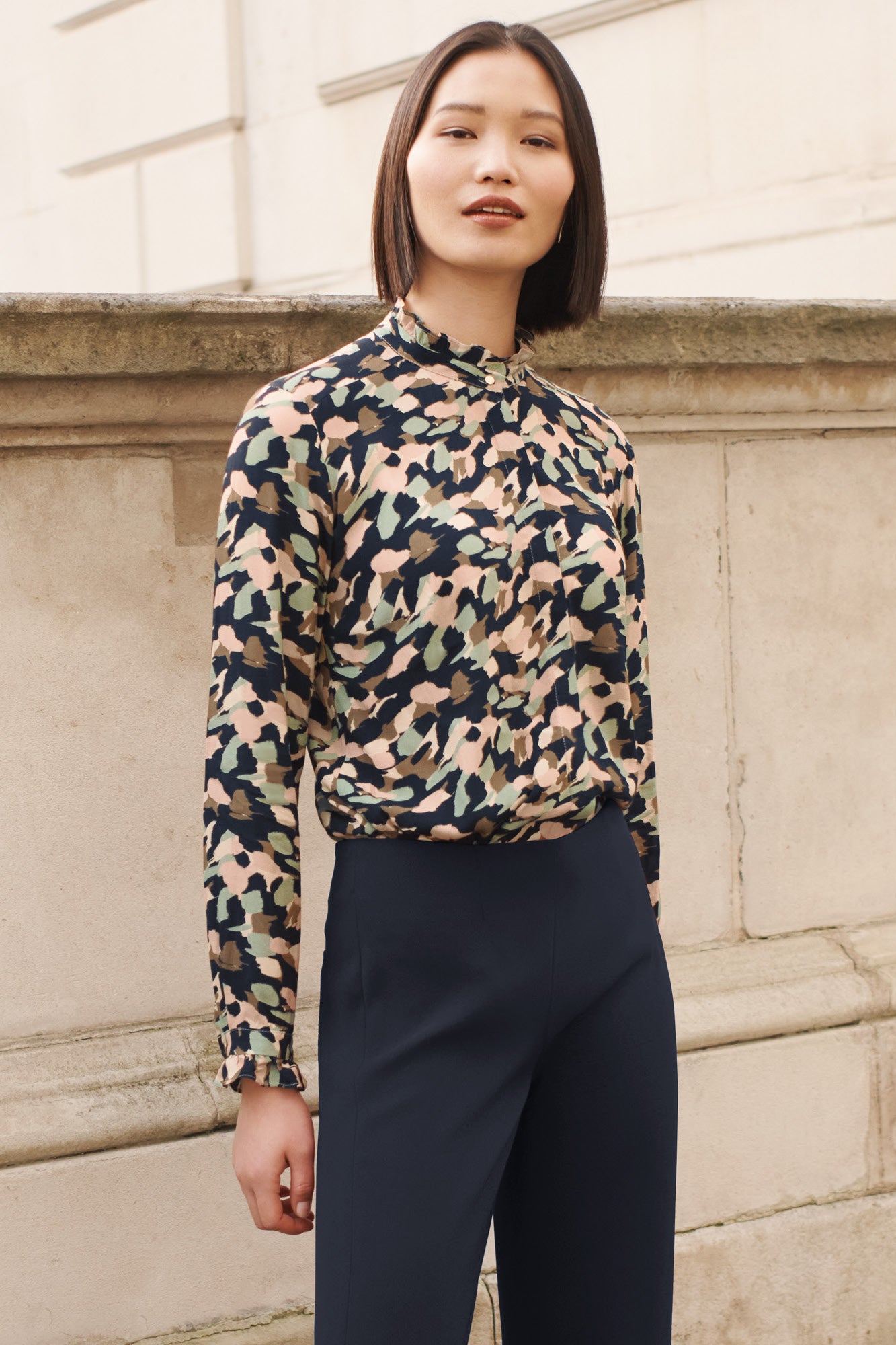 The laid back femininity of the Canterbury blouse is perfect for sophisticated workwear or chic evening wear. This loose fitting blouse features an elegant ruffled collar with a single statement gold button at the neck and concealed front placket.