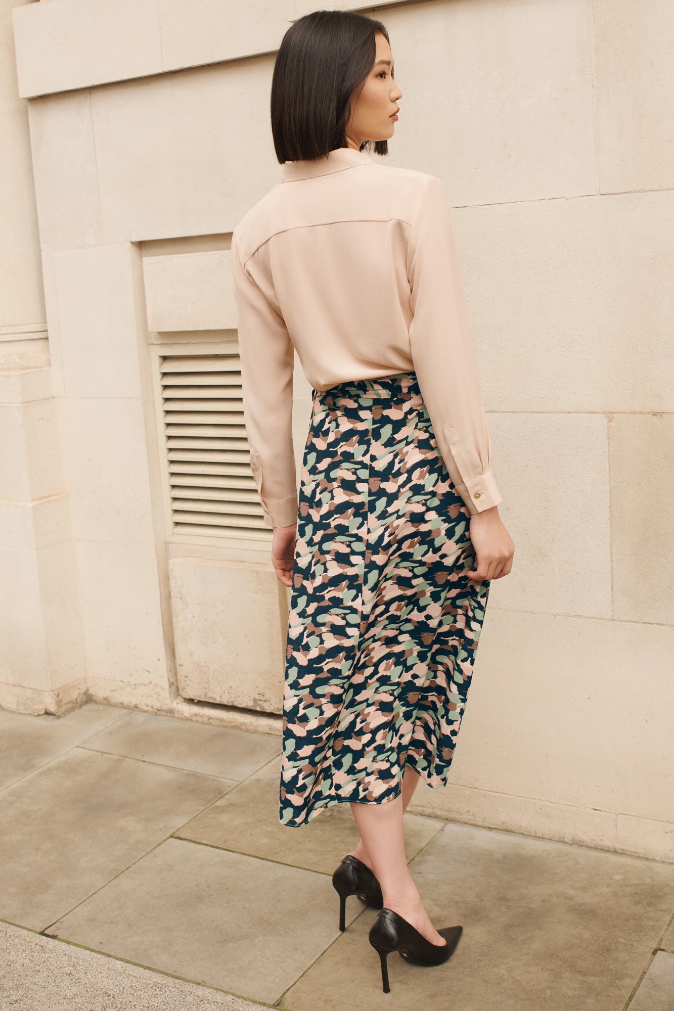 An updated take on a feminine shape, the Hamble Skirt is an elegant wrap skirt crafted in our elegant Brush print . Falling below the knee, this timeless style features a wrap belt with a feature D-ring, allowing for definition at the waist. Pair with a structured jacket to instantly elevate it for the work place.