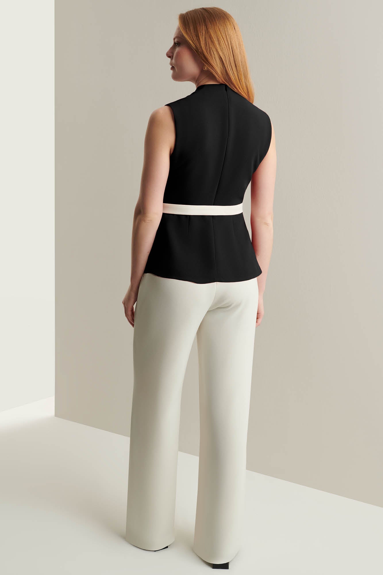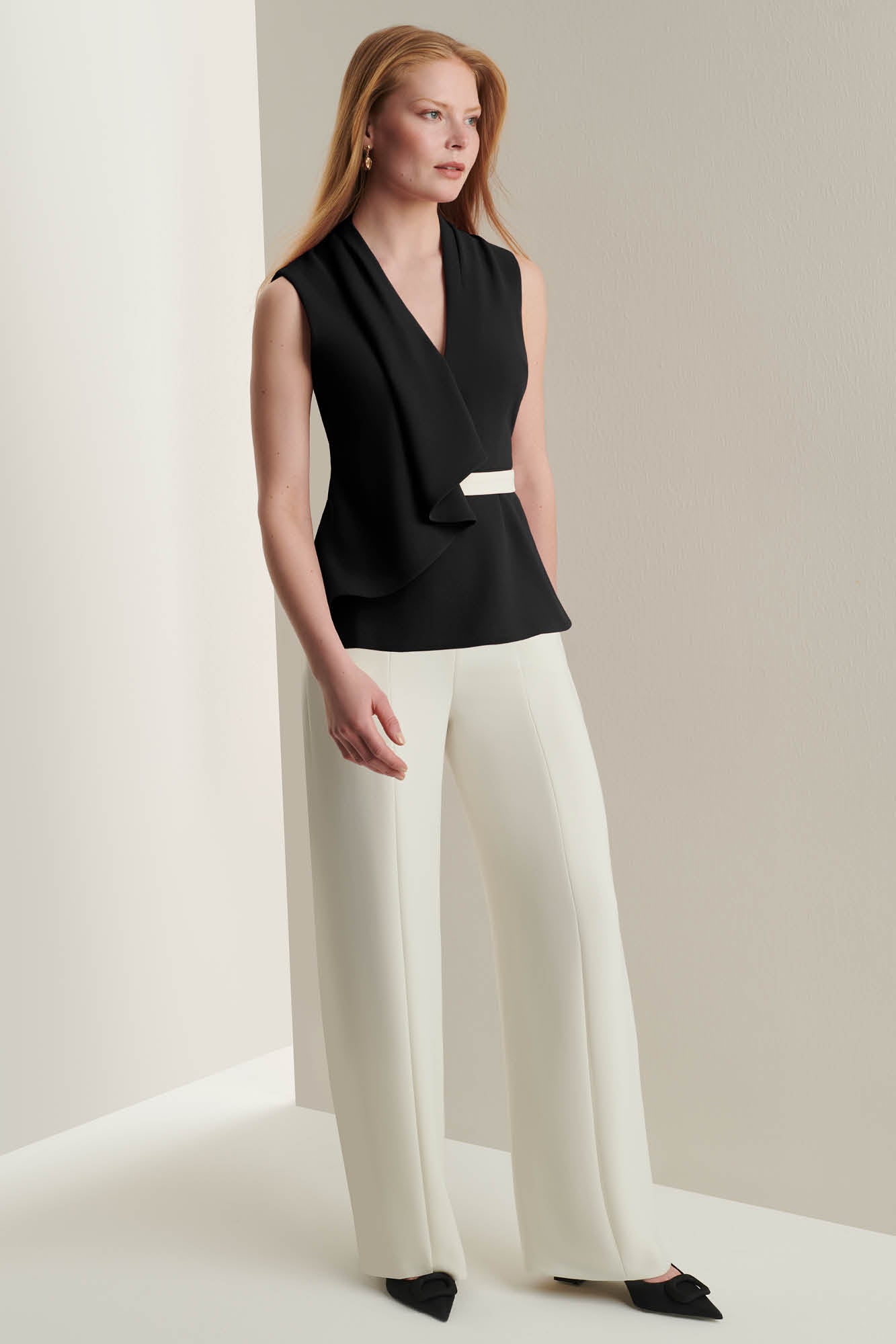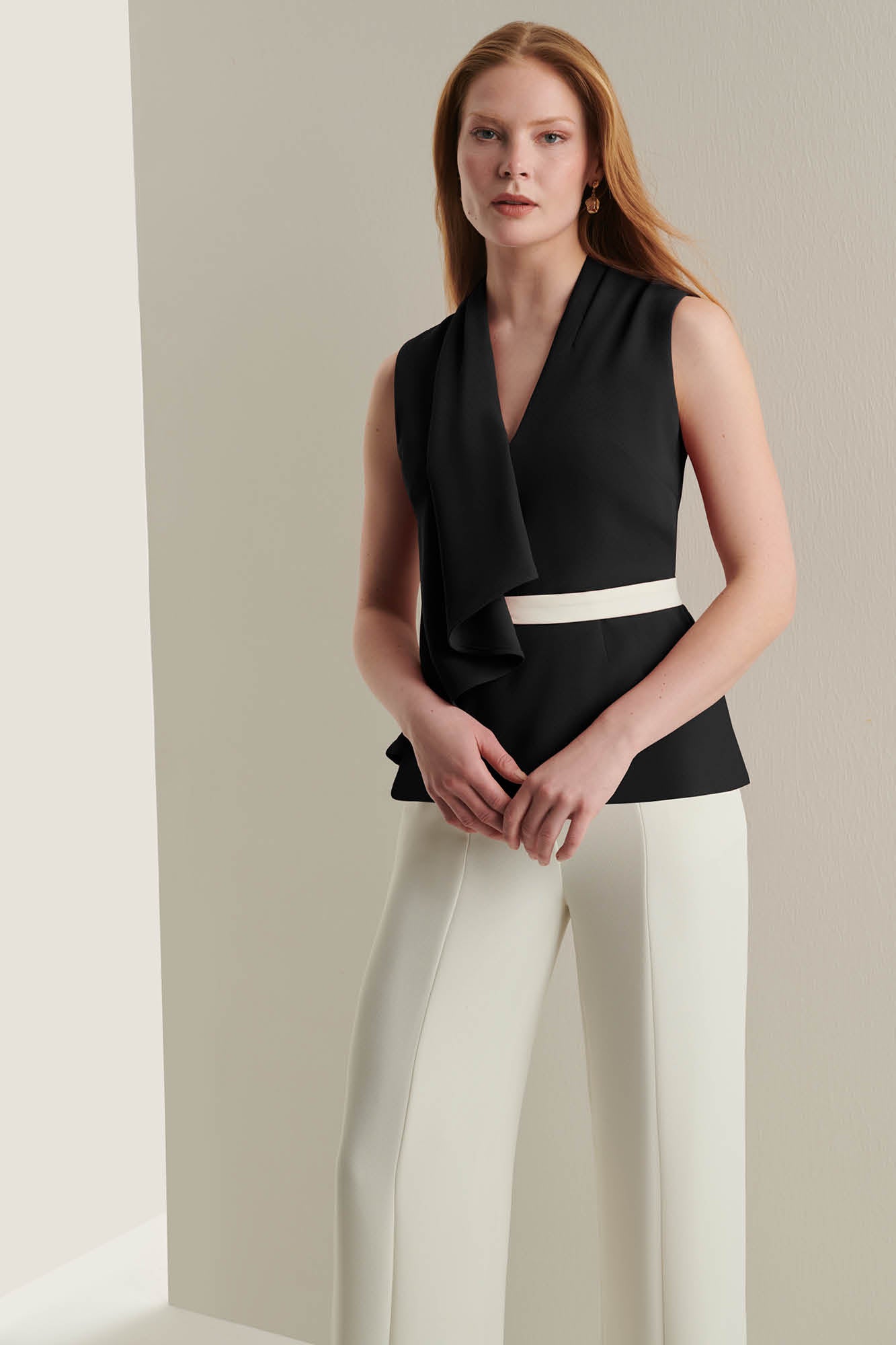 Structured shaping is combined with a softly draped waterfall front to create an elegant and figure flattering look in the Tatton top. The contrast ivory belt creates a focal point at the waist while the gentle peplum of the waist skims over your stomach. Create an elegant and lengthened silhouette with a wider legged trouser like the Harlequin. Whether it’s in ivory for your next event or classic black suiting.