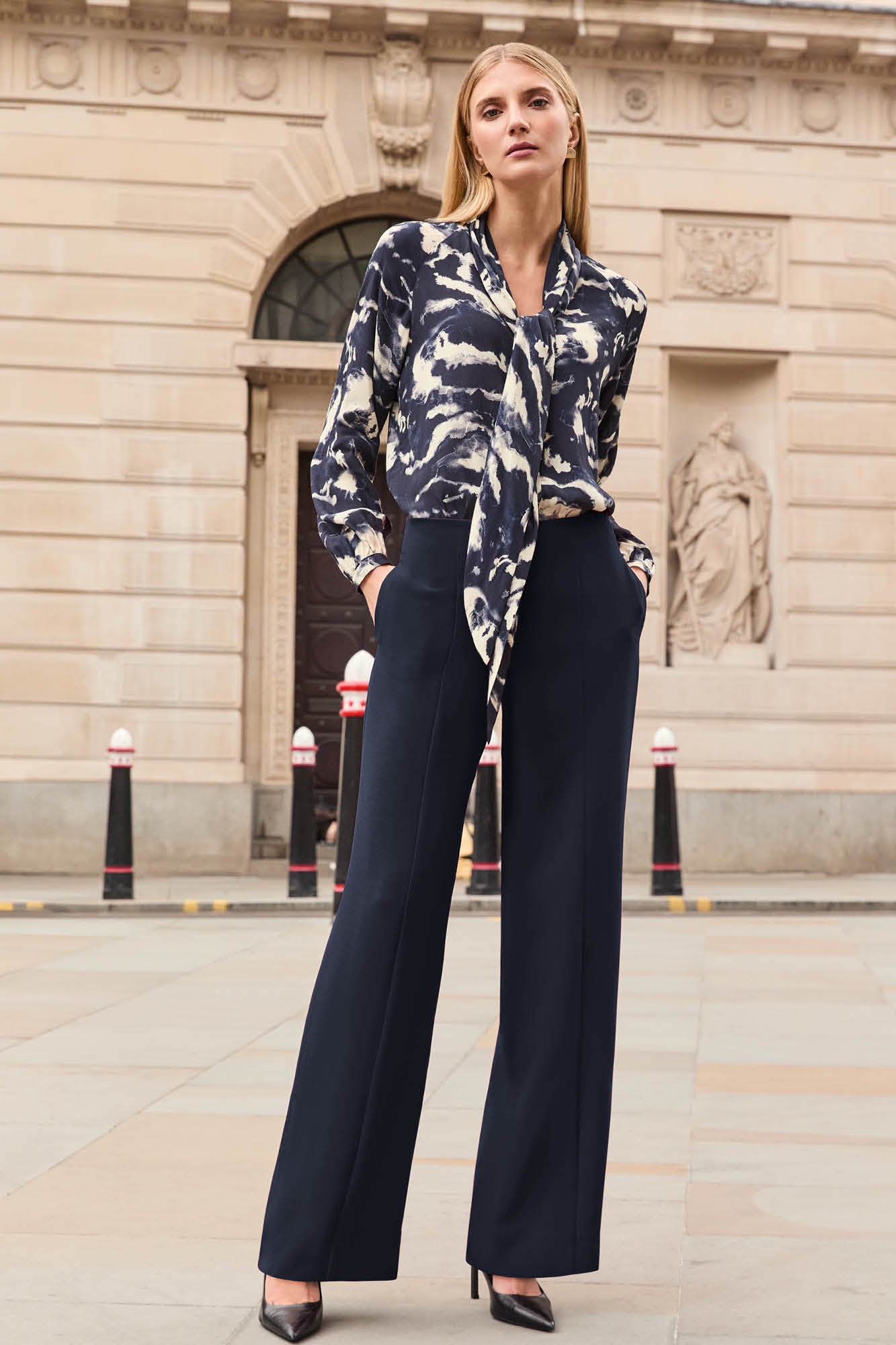 Elegantly feminine, the Wellow blouse is a workwear winner. Cut in our glorious clouds print the soft swirls of dark colour add to the effect of the graceful neck tie and raglan sleeves that end in gently gathered cuffs, creating a flattering soft silhouette. Paired with our Performance Tailoring it's the ultimate in soft power, or go for bold with our Cardinal red suiting.