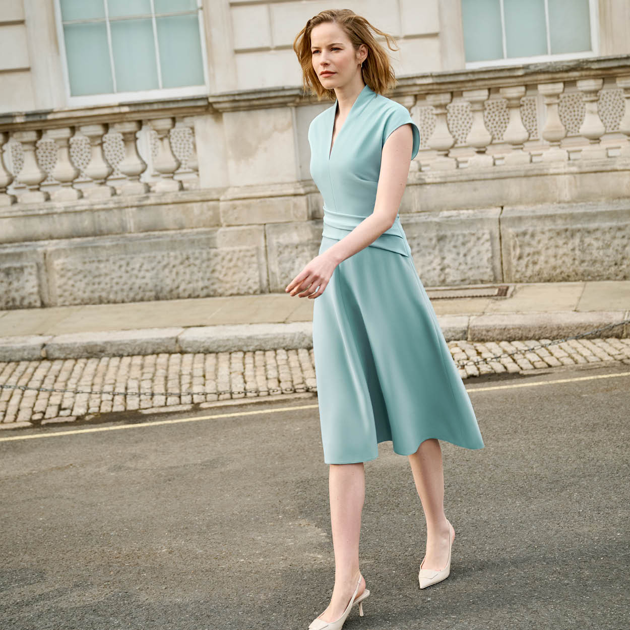 Litchfield is an extremely flattering fit and flare shaped dress with a waist defining pleated detail on both the back and front.  Cut with a cap sleeve that gives a bit of arm coverage but will keep you cool in the summer heat.  Litchfield features our signature gold exposed back zip with our bespoke puller.