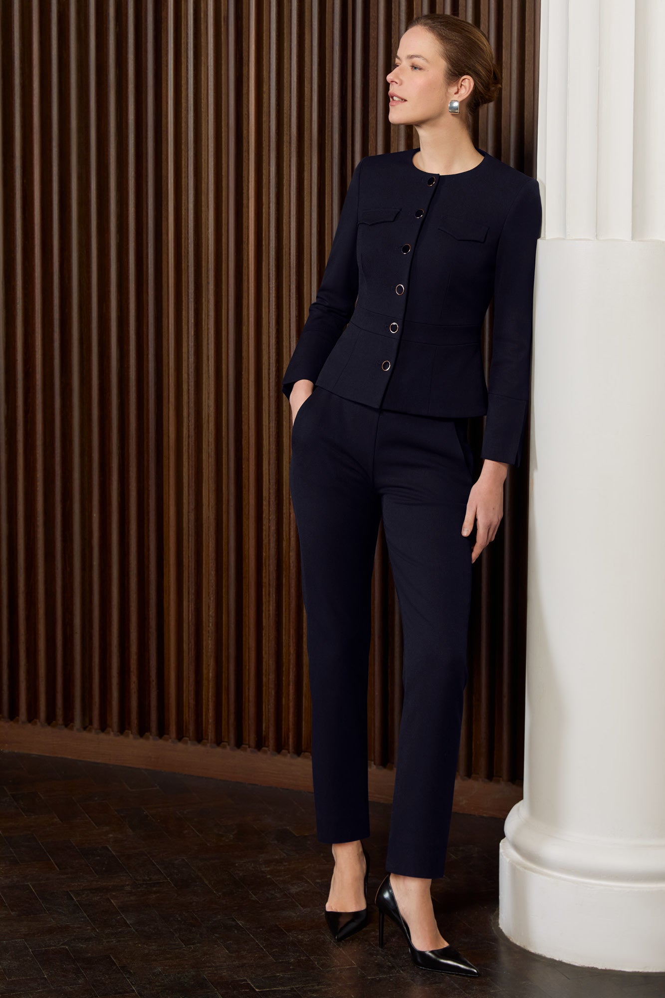The clean-cut, timeless Connaught jacket is an effortless way to lift simple day looks or pair with tailored trousers for evening elegance. Its collarless design, statement buttons, sleeve slits and faux flap pockets lend attention-to-detail and keep it contemporary. Connaught’s intricate panelling shows off Libby’s signature British tailoring.