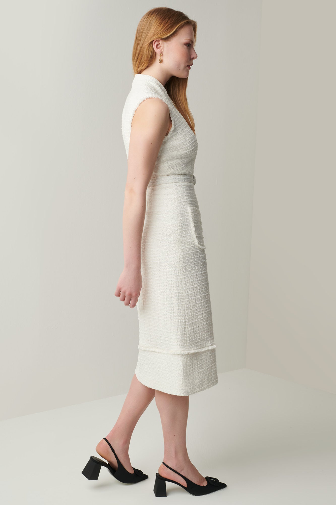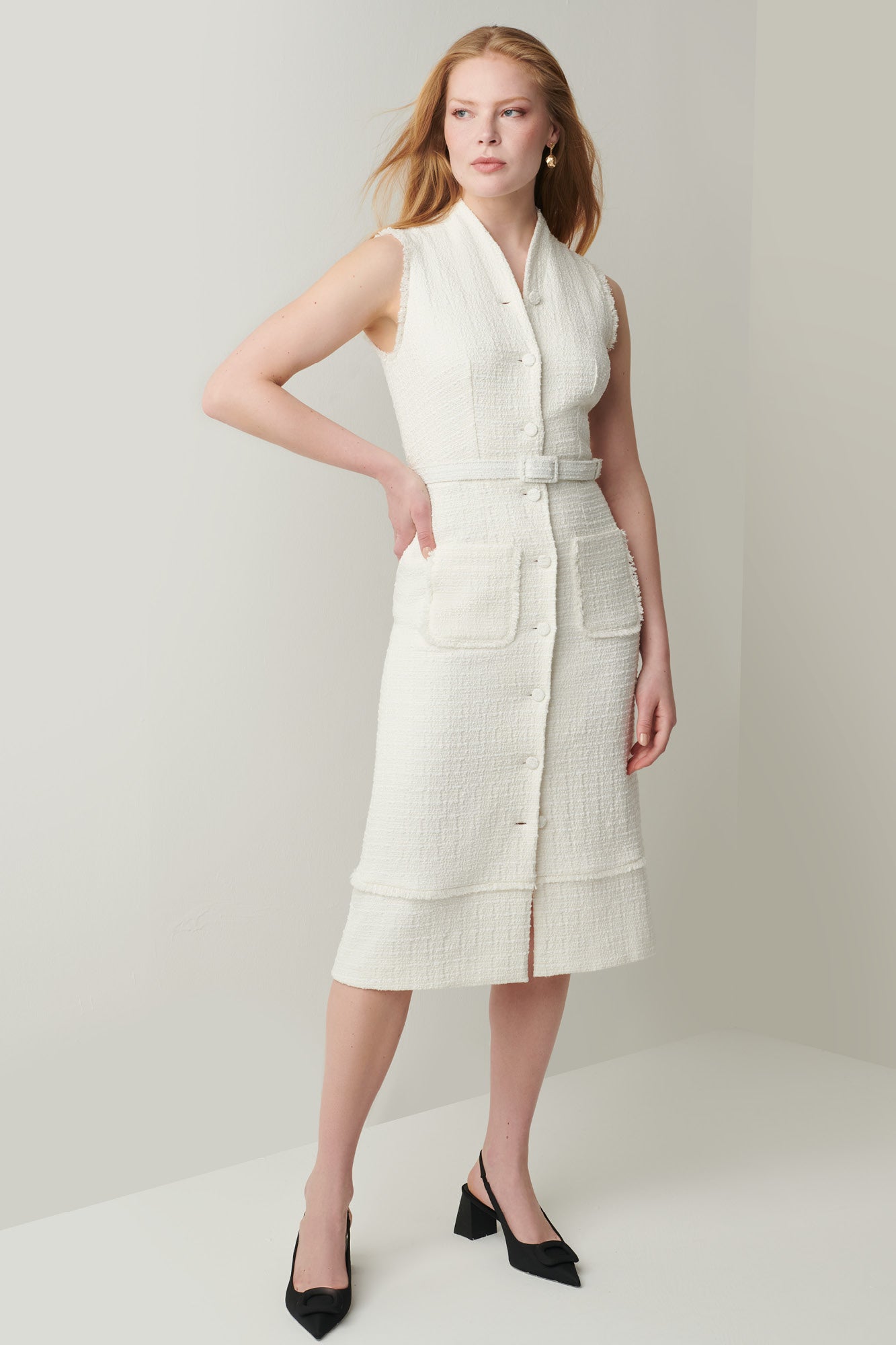 This figure-defining, sleeveless dress with its elegant A-line shape is cut in a beautiful French  jacquard, creating a flattering textured effect. From the quality of the stitching to the placement of the buttons, every aspect of the Brooklyn Dress has been carefully considered with your comfort and confidence in mind. Featuring two front pockets a false button up front and elegant fringing details. This tailored design is a minimalistic yet stunning essential piece for your summer work wardrobe, that will take you to your summer events just as easily as your next meeting.