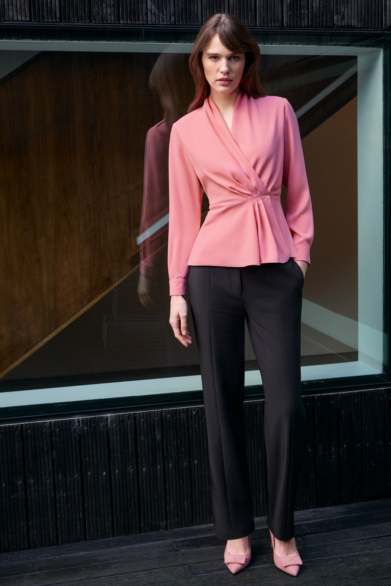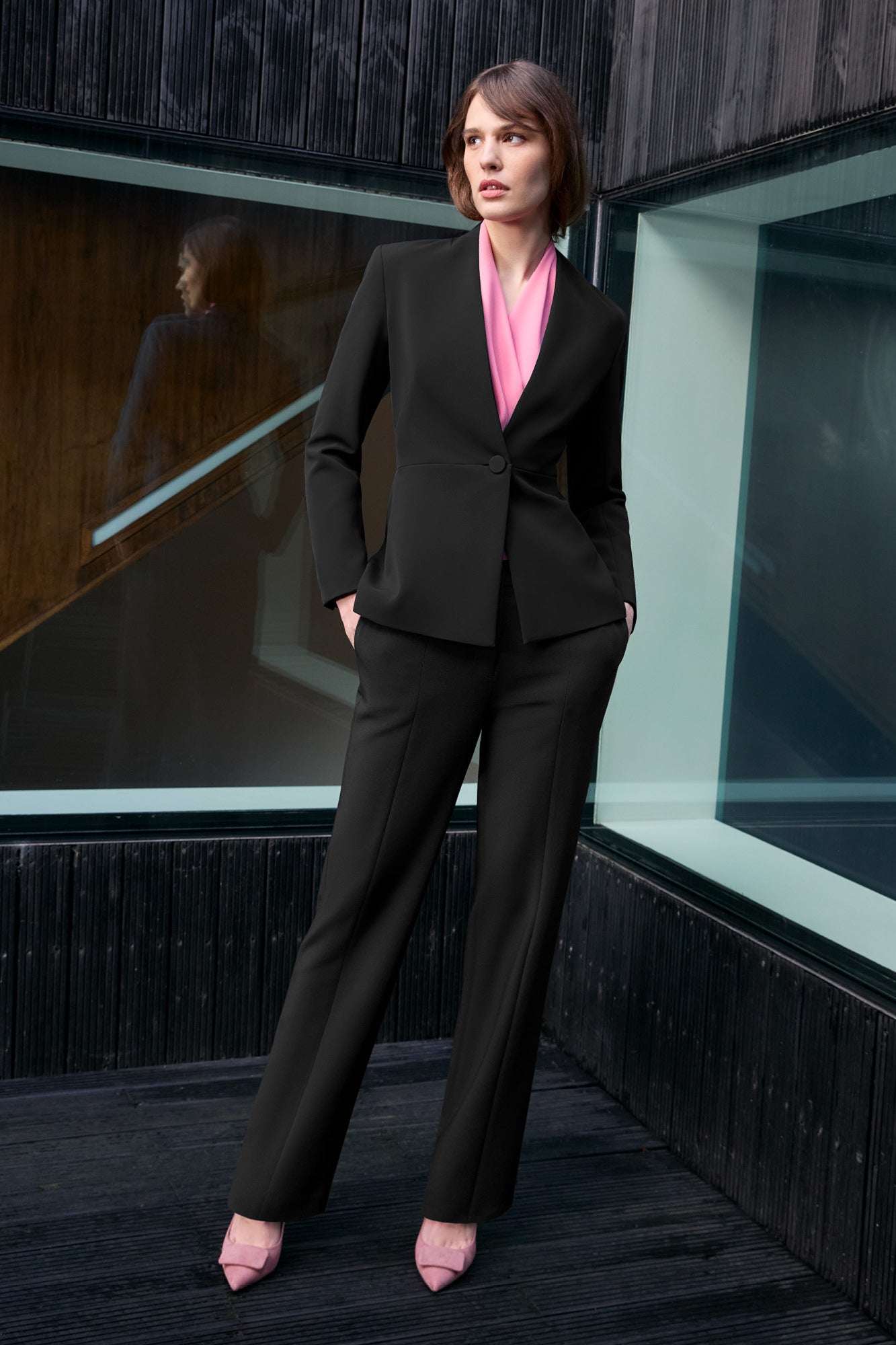 Model wears with our Brompton Jacket in Black Performance Tailoring and our Ravello Blouse in Oyster.