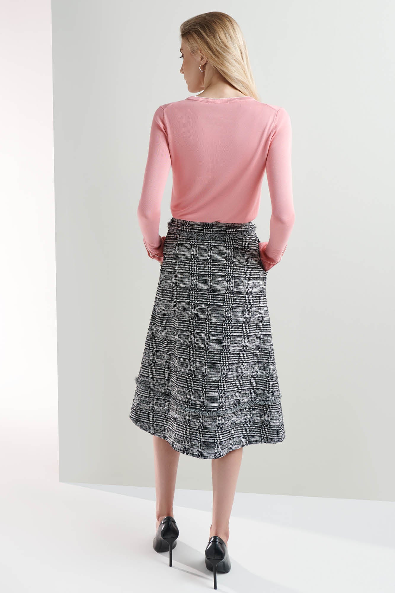 A statement skirt to elevate your work wardrobe. The Arosa skirt is the perfect mixture of structure and movement. Cut in an elegant jacquard with a modern fringe trim adding a touch of texture. Dress it up with our Weston shirt for a twist on a classic styling or add a jumper like the Maddy knit and boots as we move into cooler weather.