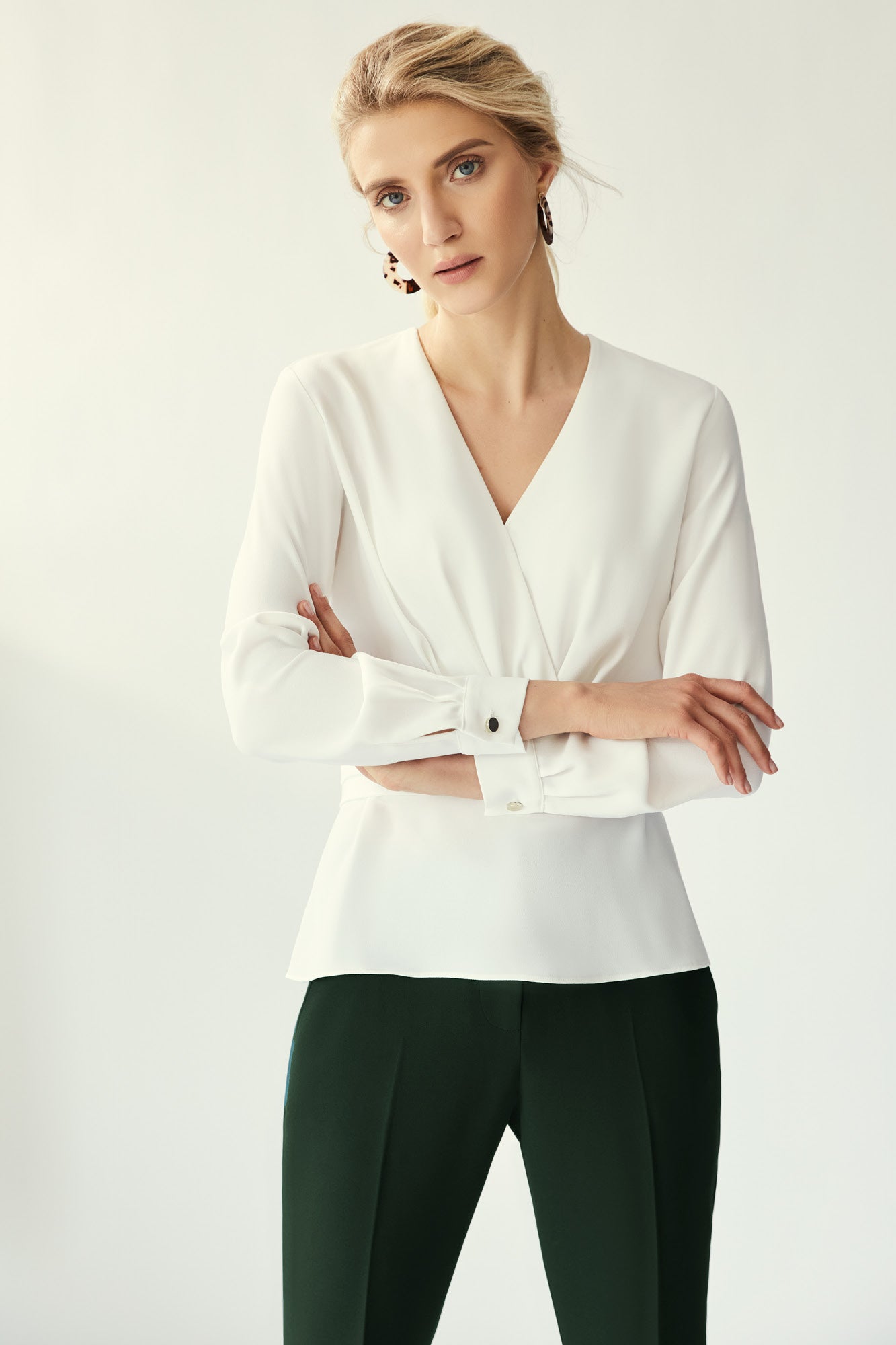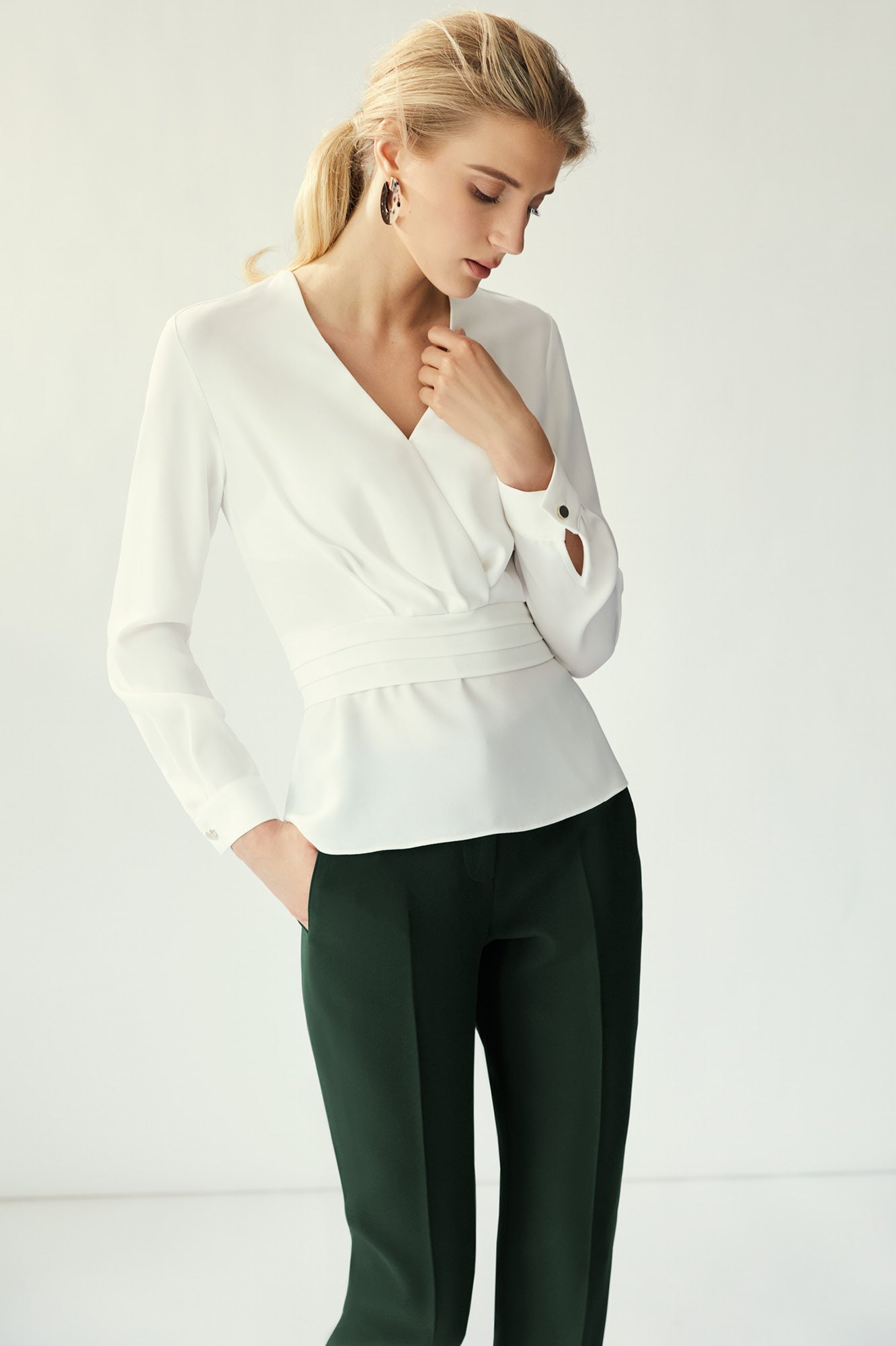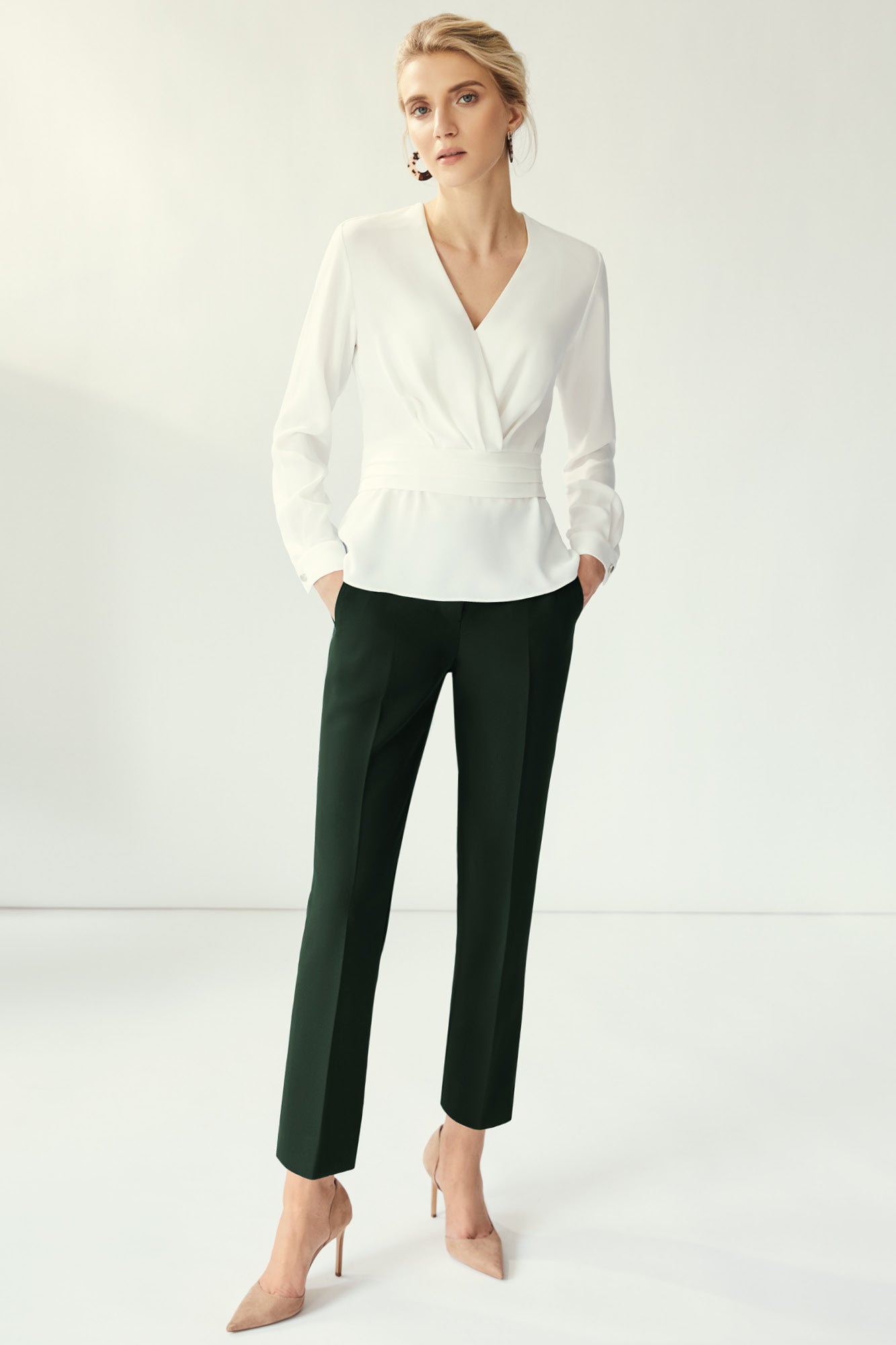 The draped V-neck on the Whistler blouse intricately wraps into the pleated waistband, elegantly framing your décolletage and drawing the eye to the narrowest part of your torso. Whistler's floaty hem skims past the hips and enhances the hourglass silhouette, adding a feminine and refreshing vibe to your capsule wardrobe