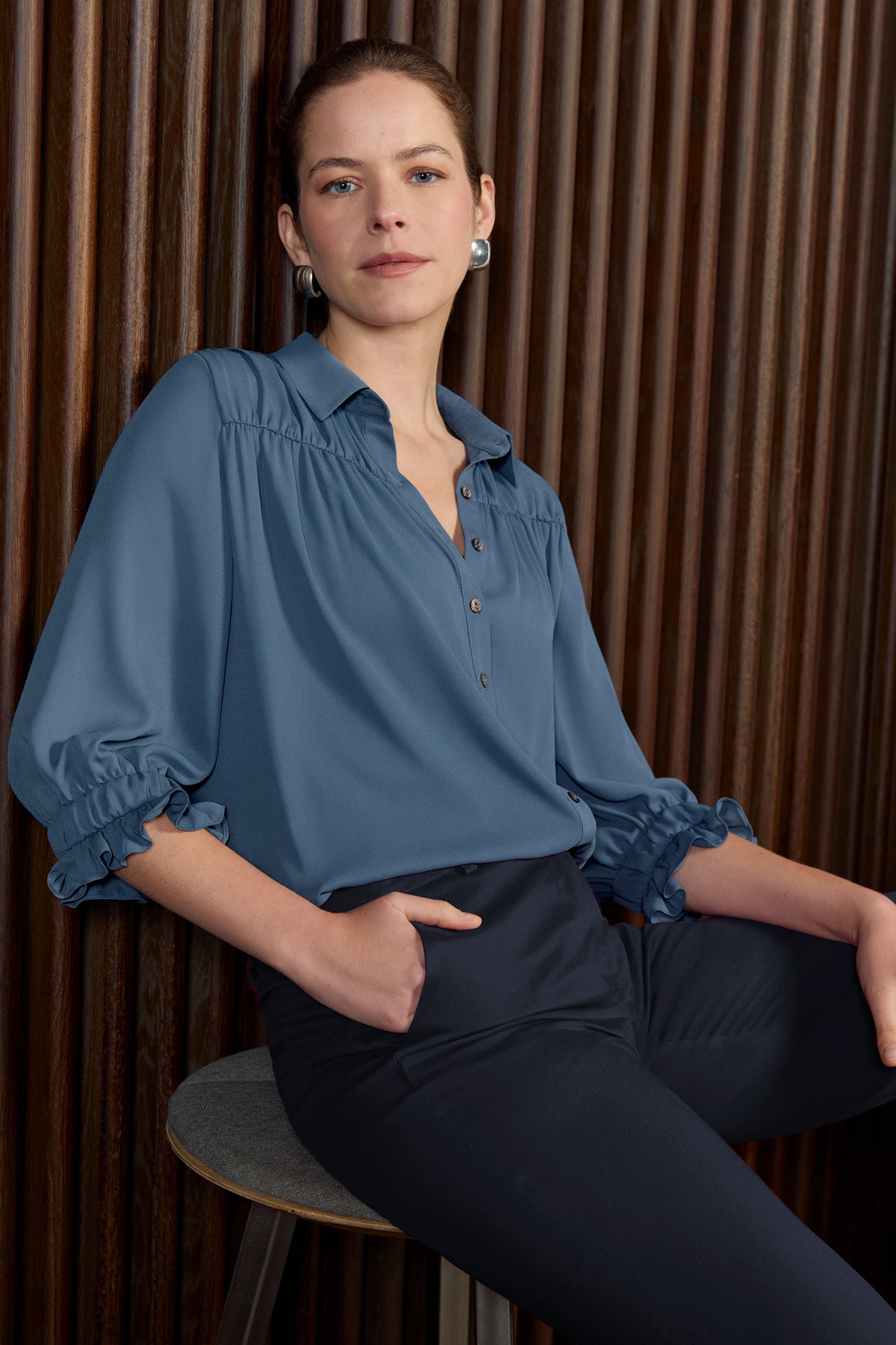 Model wears with matching Somerton Blouse and our Knightsbridge Trousers in Navy.