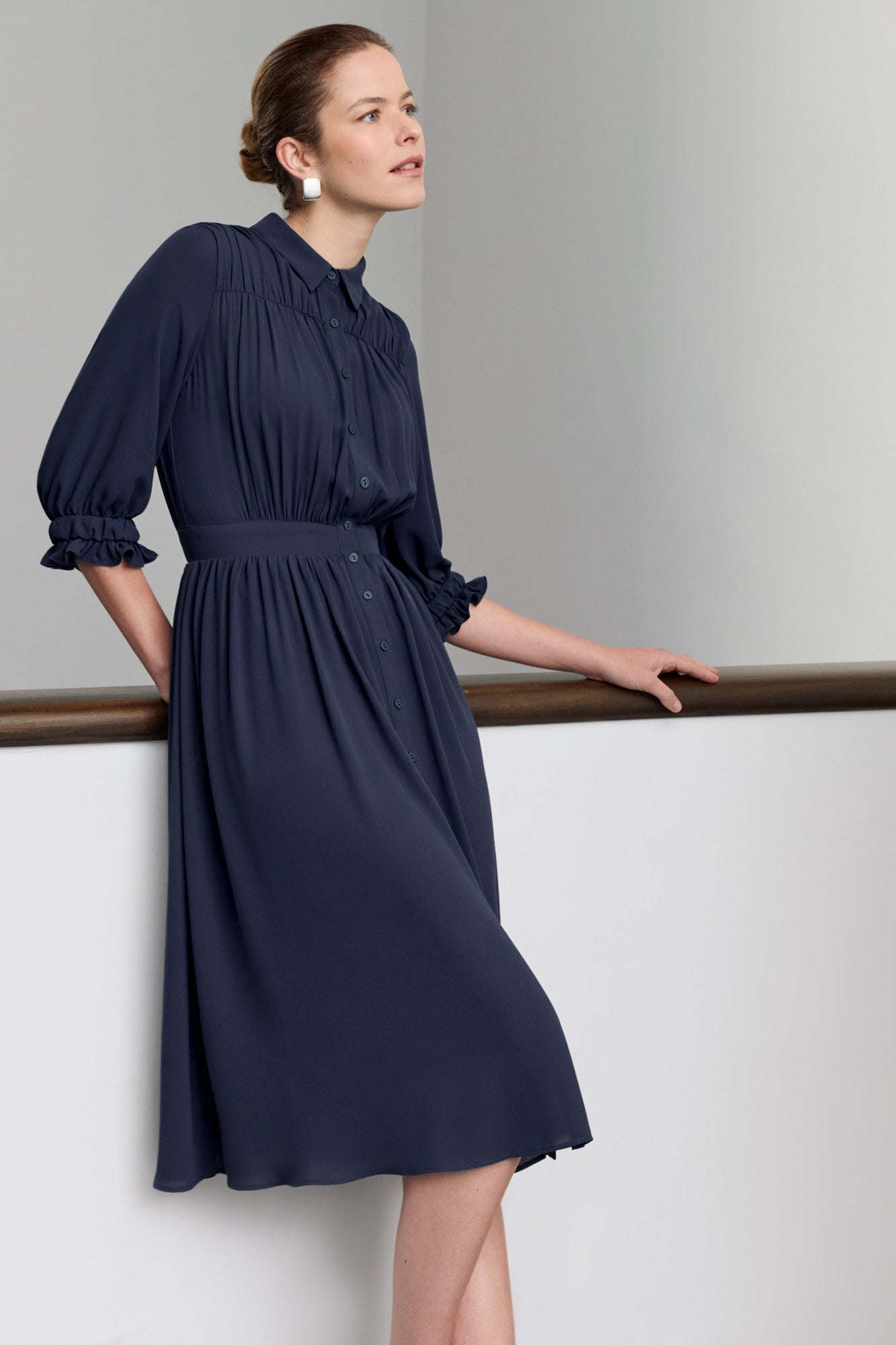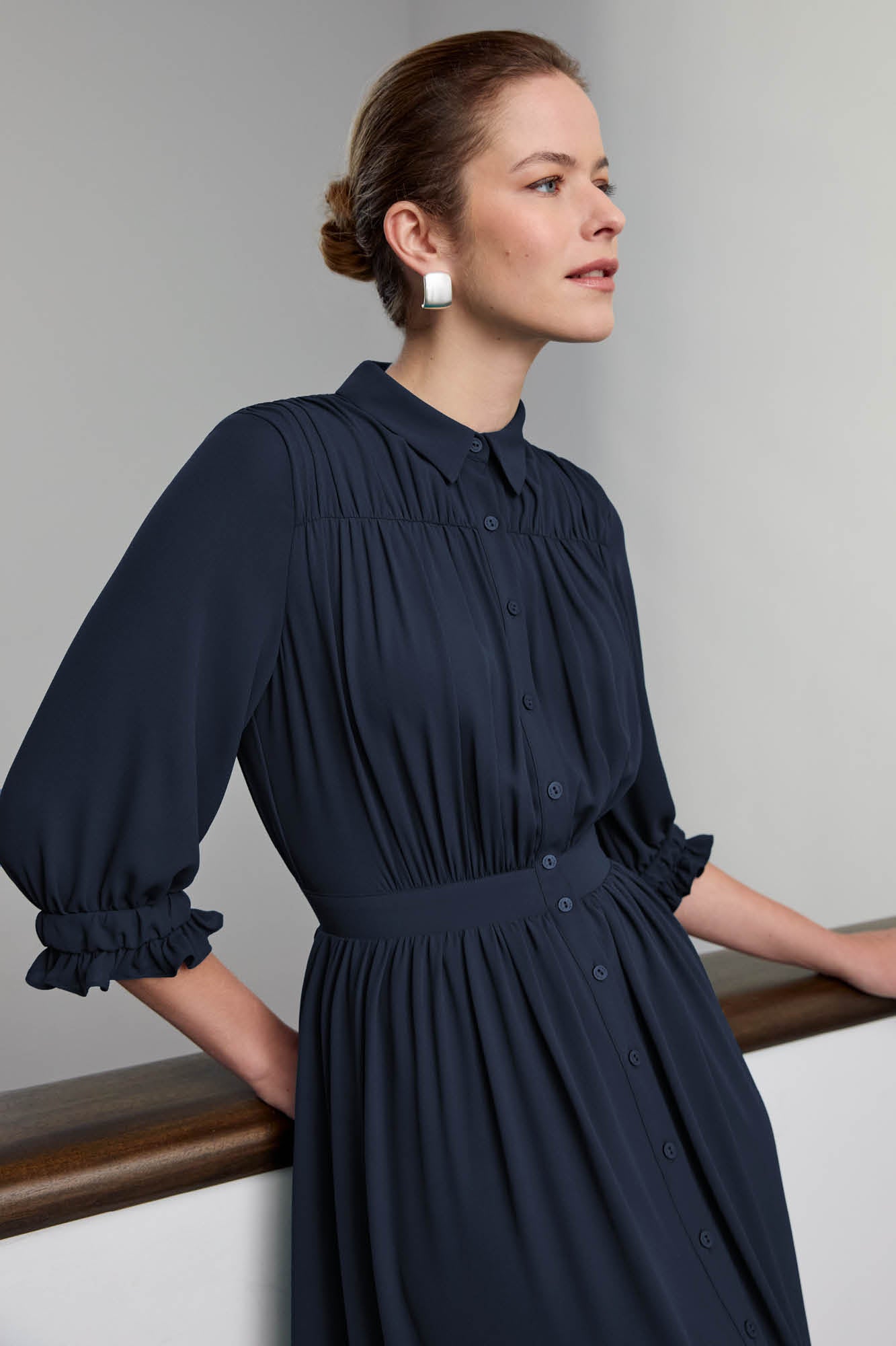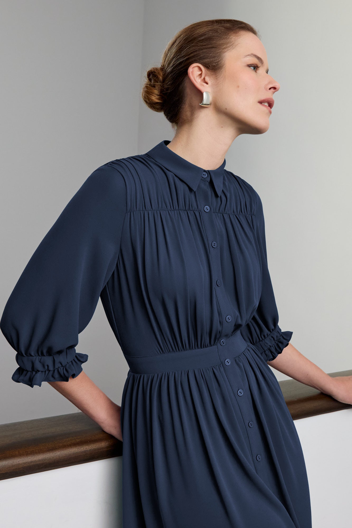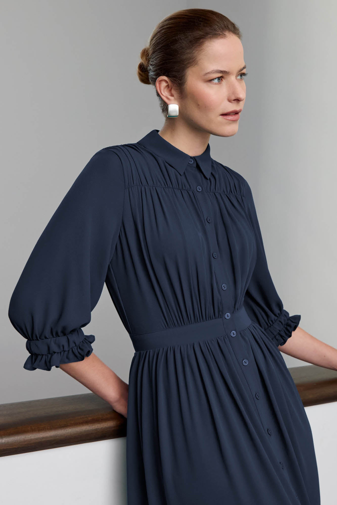 Modern femininity encapsulated in soft gathered detailing and a flowing silhouette. Casablanca is a shirt dress with a romantic feel, double-layer georgette is gathered at the shoulders to create a beautiful draped bodice. The sleeves finish just below the elbow in a cinched elastic cuff that adds a gentle volume.