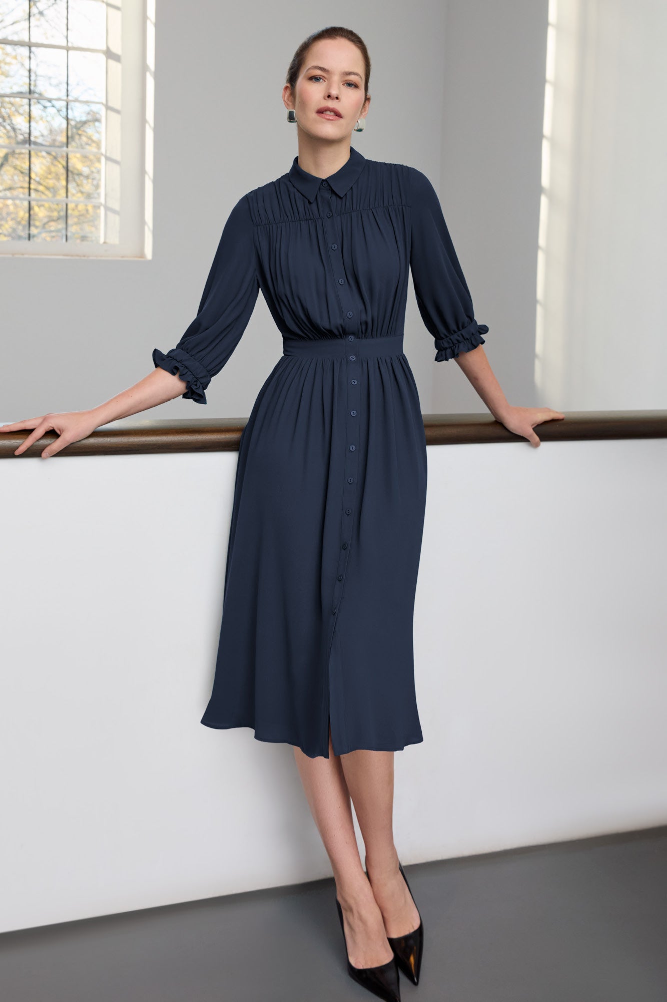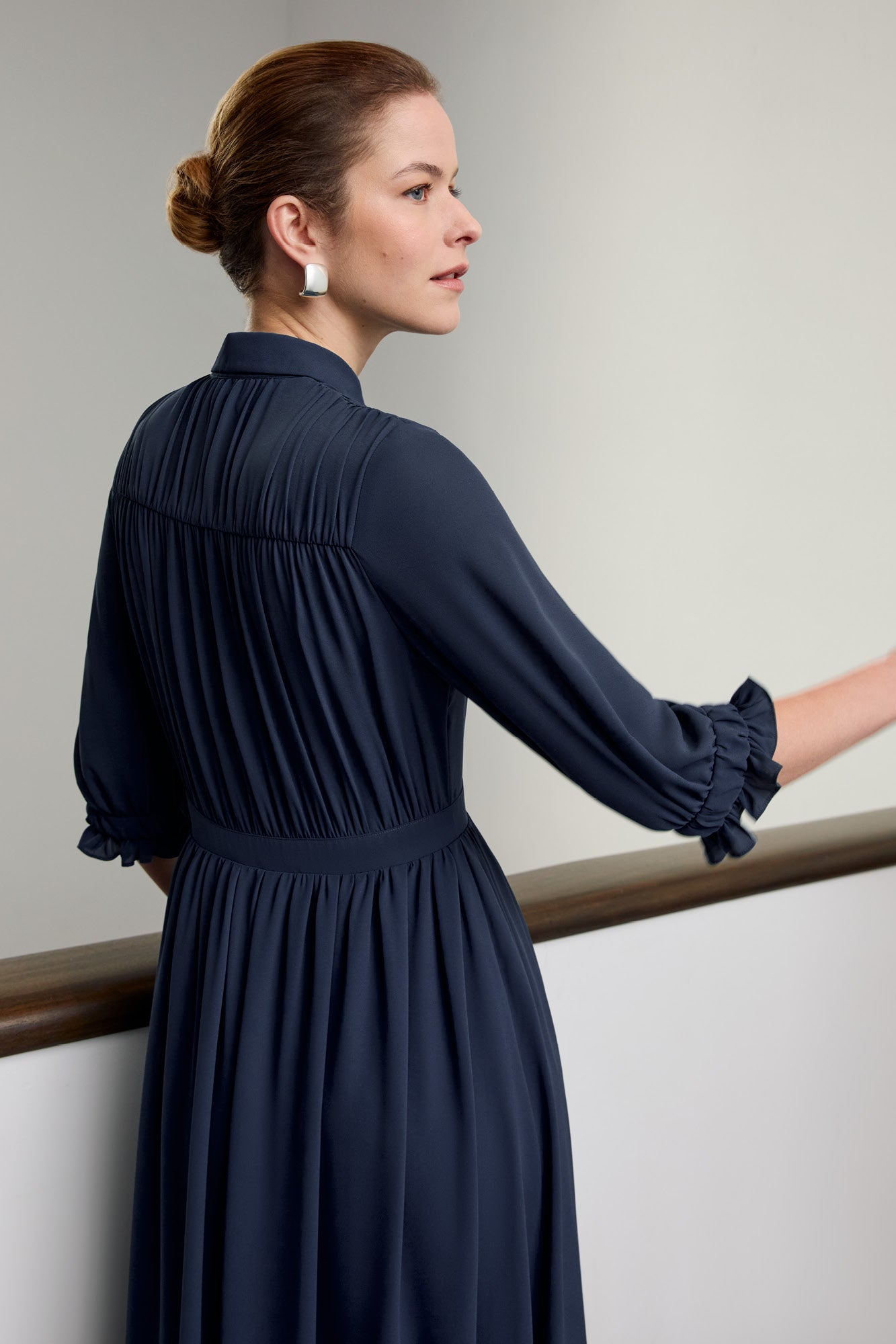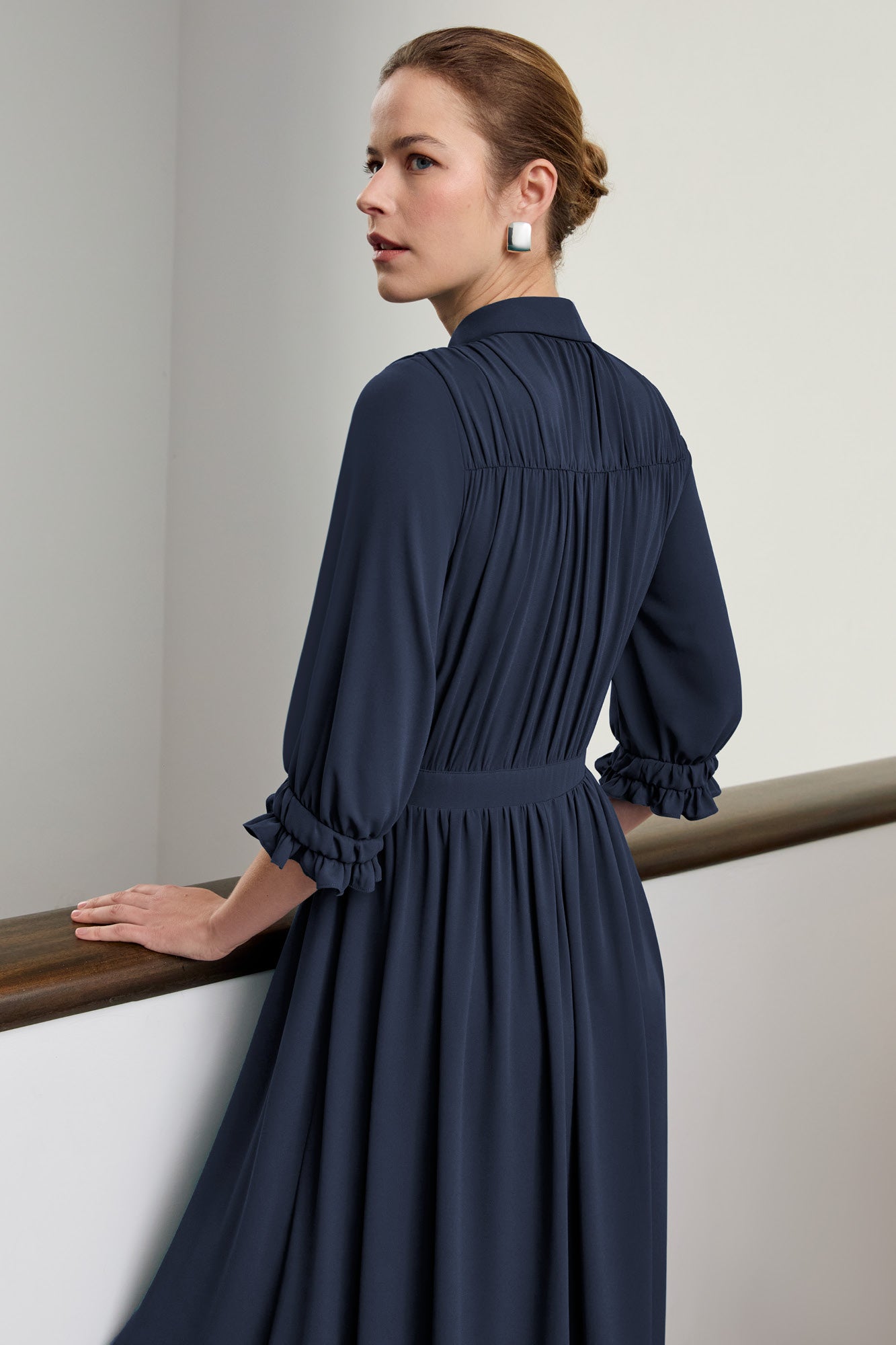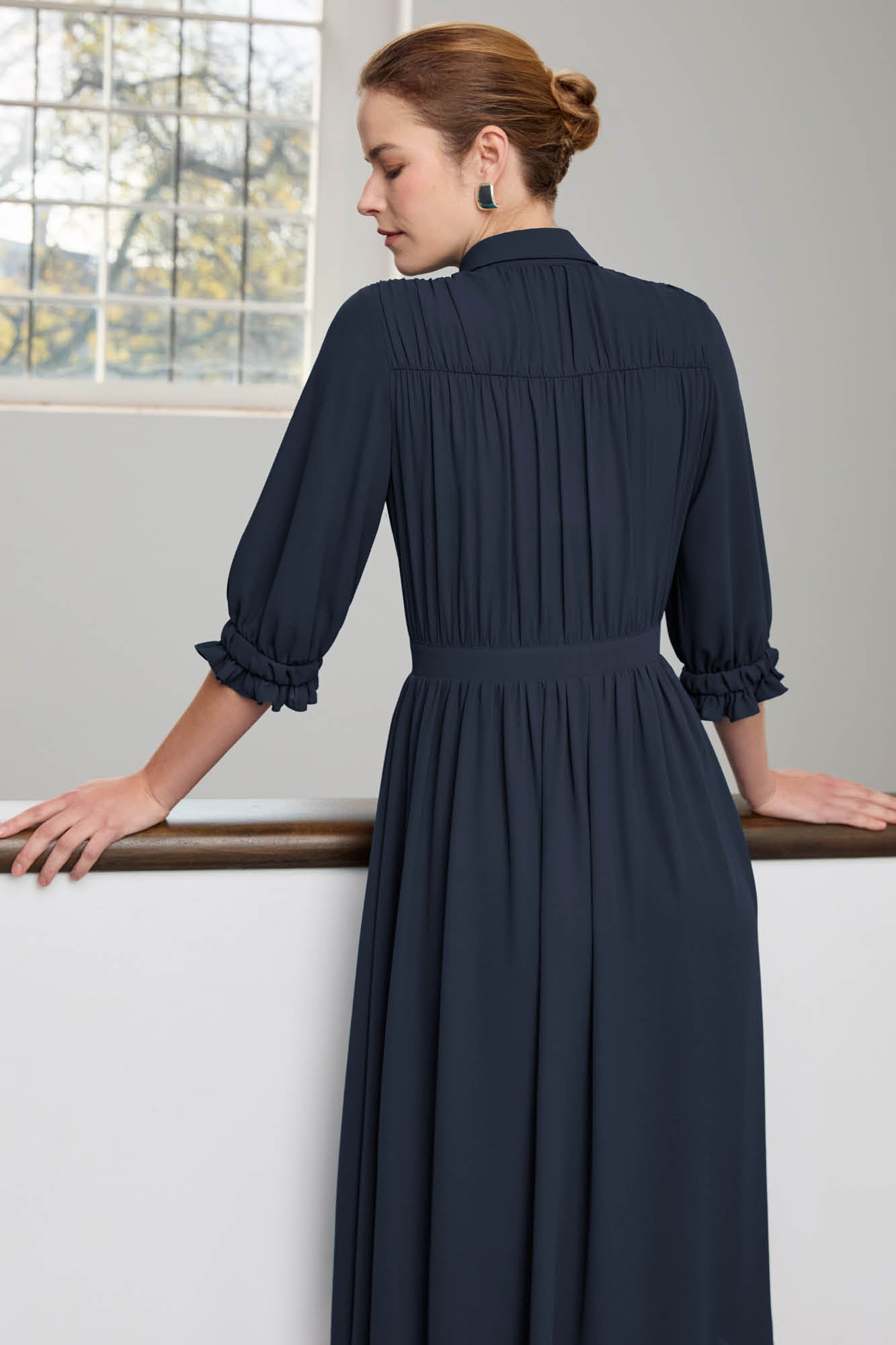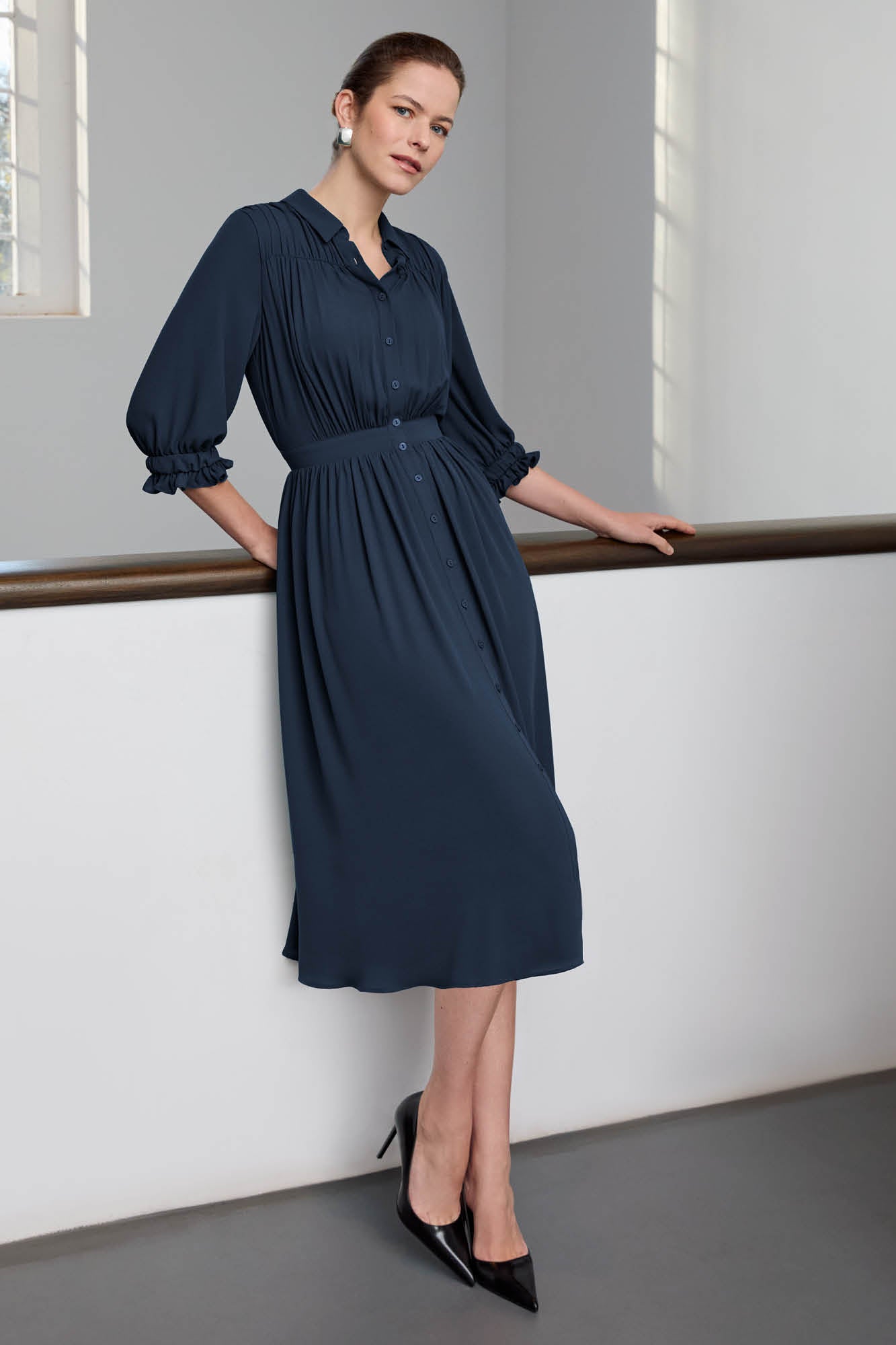 Modern femininity encapsulated in soft gathered detailing and a flowing silhouette. Casablanca is a shirt dress with a romantic feel, double-layer georgette is gathered at the shoulders to create a beautiful draped bodice. The sleeves finish just below the elbow in a cinched elastic cuff that adds a gentle volume.