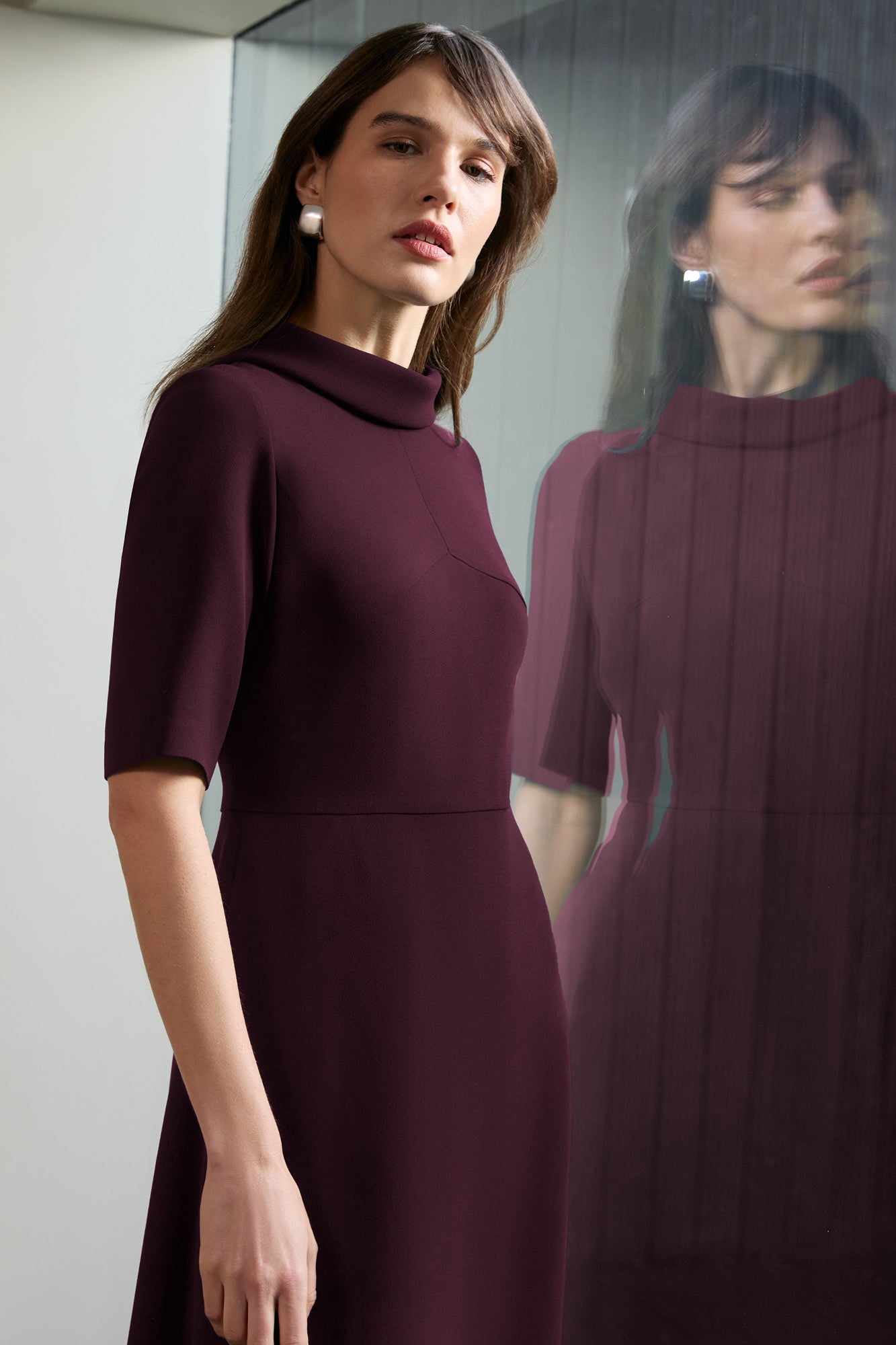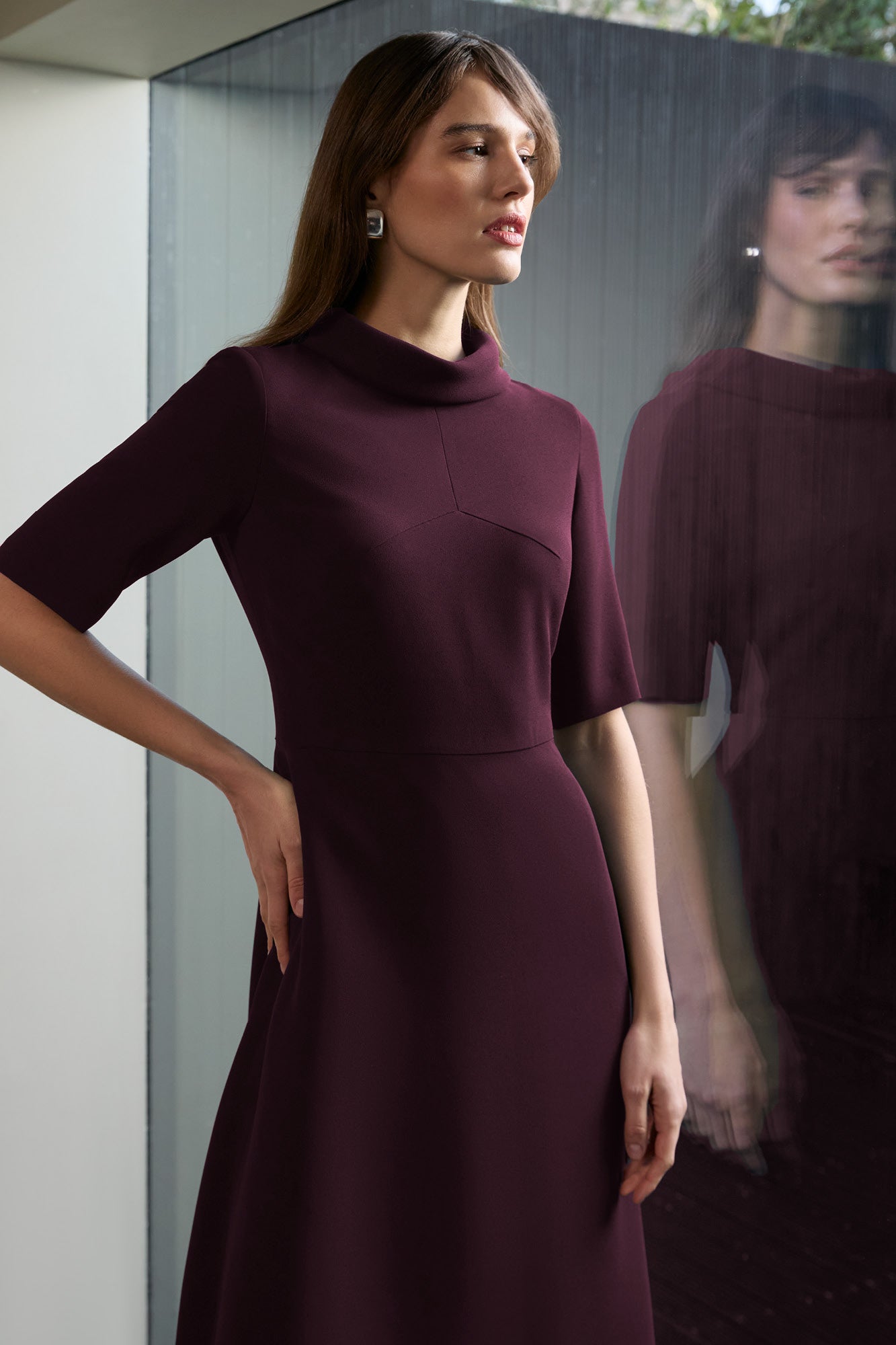 The Devonshire dress is the definition of elegance and class. Constructed from our signature soft crease-free crepe (which allows the neckline to drape perfectly), the A-line skirt skims over the hips, creating a fit and flare shape.