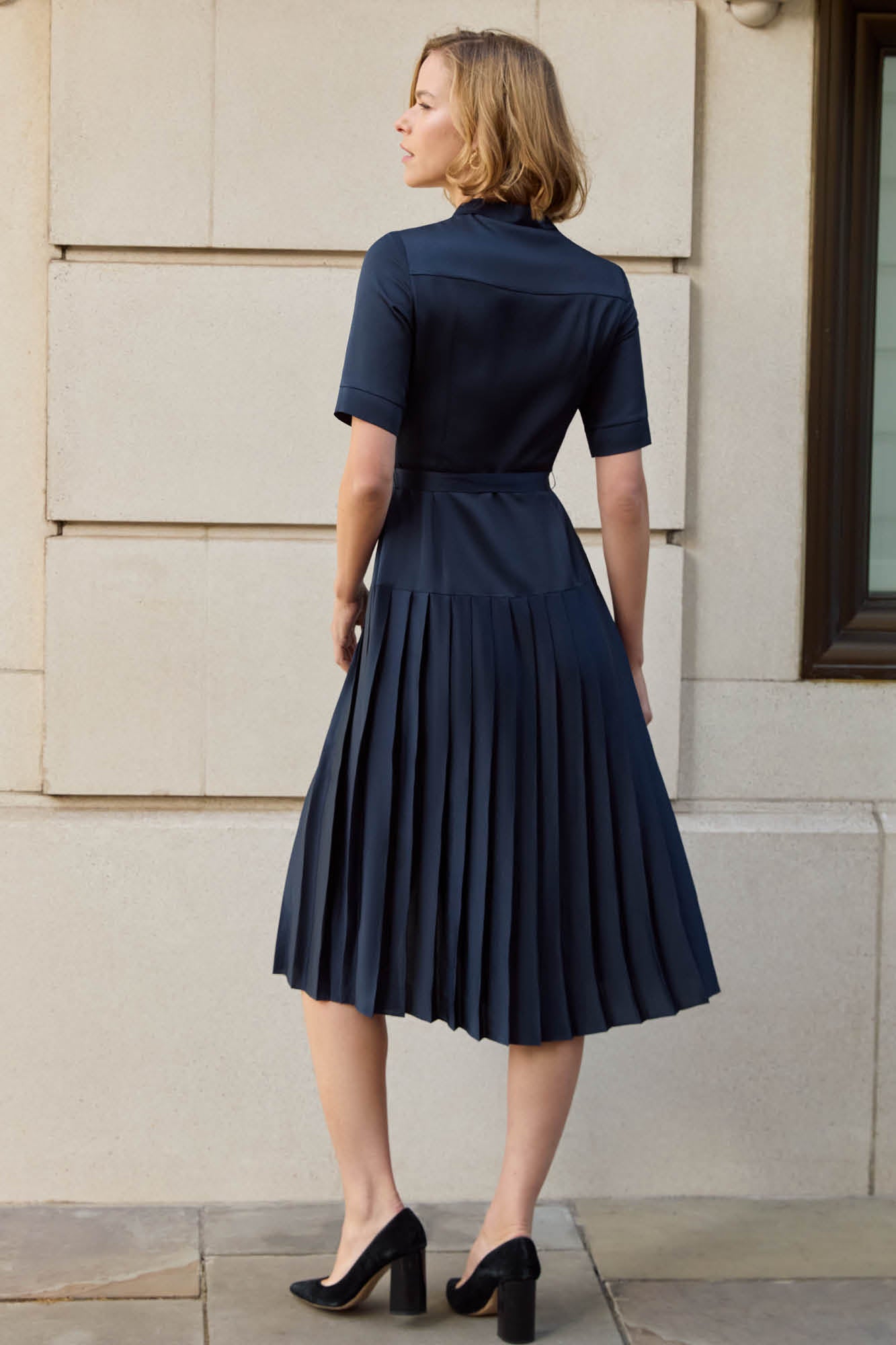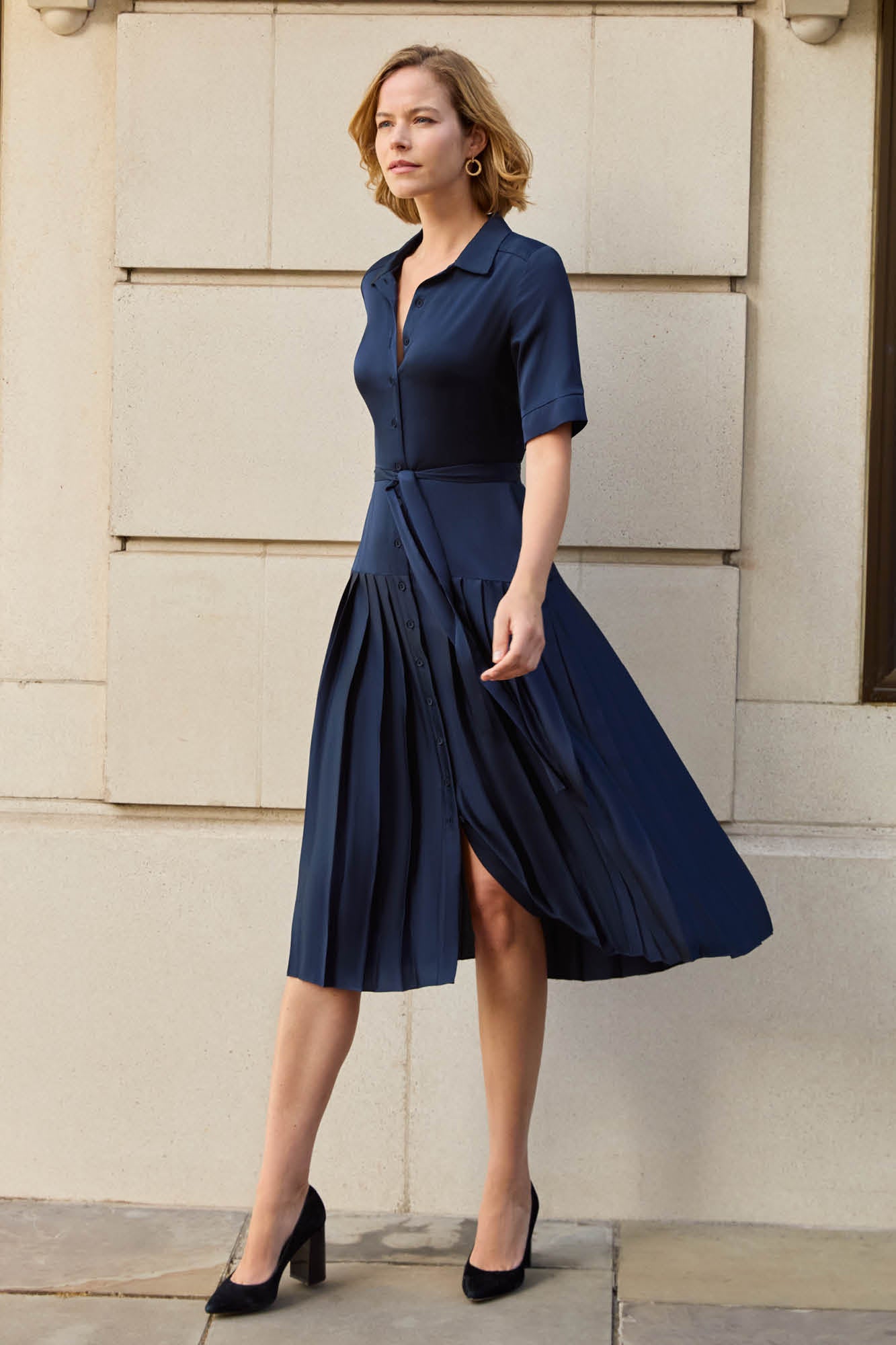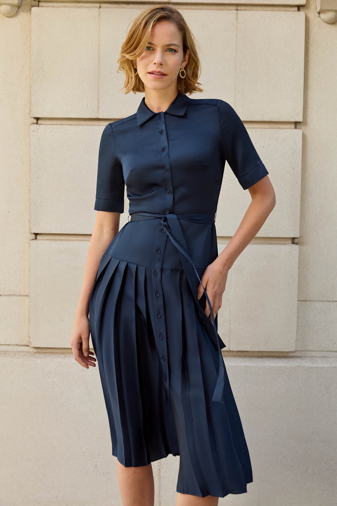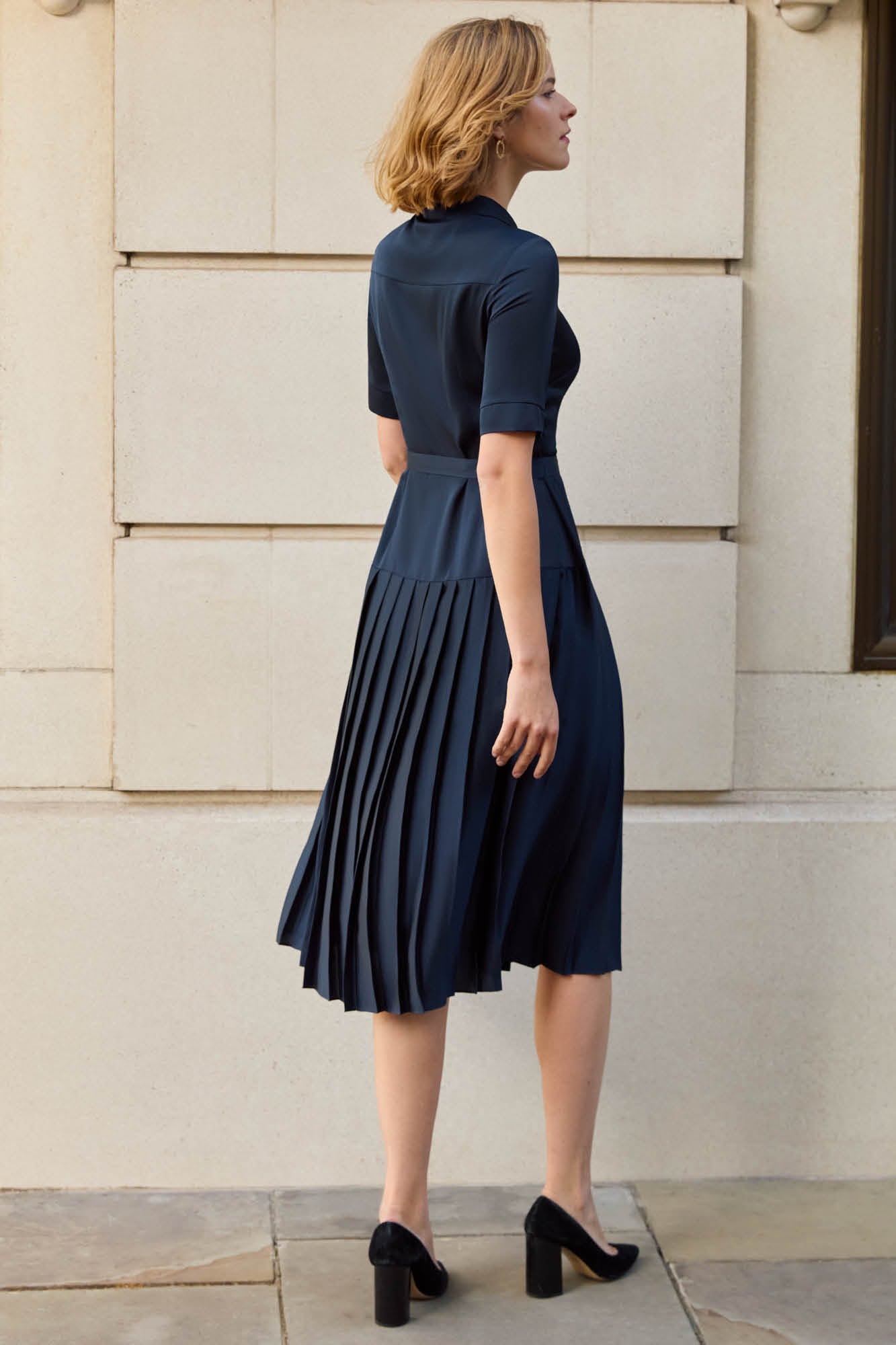 Beautifully cut, this midi-length dress features an elegantly pleated skirt. The graduated drop waist slims the hips, whilst flattering the waist. Adding a modern edge to this shirt dress, with sleeves that finish just above the elbow.