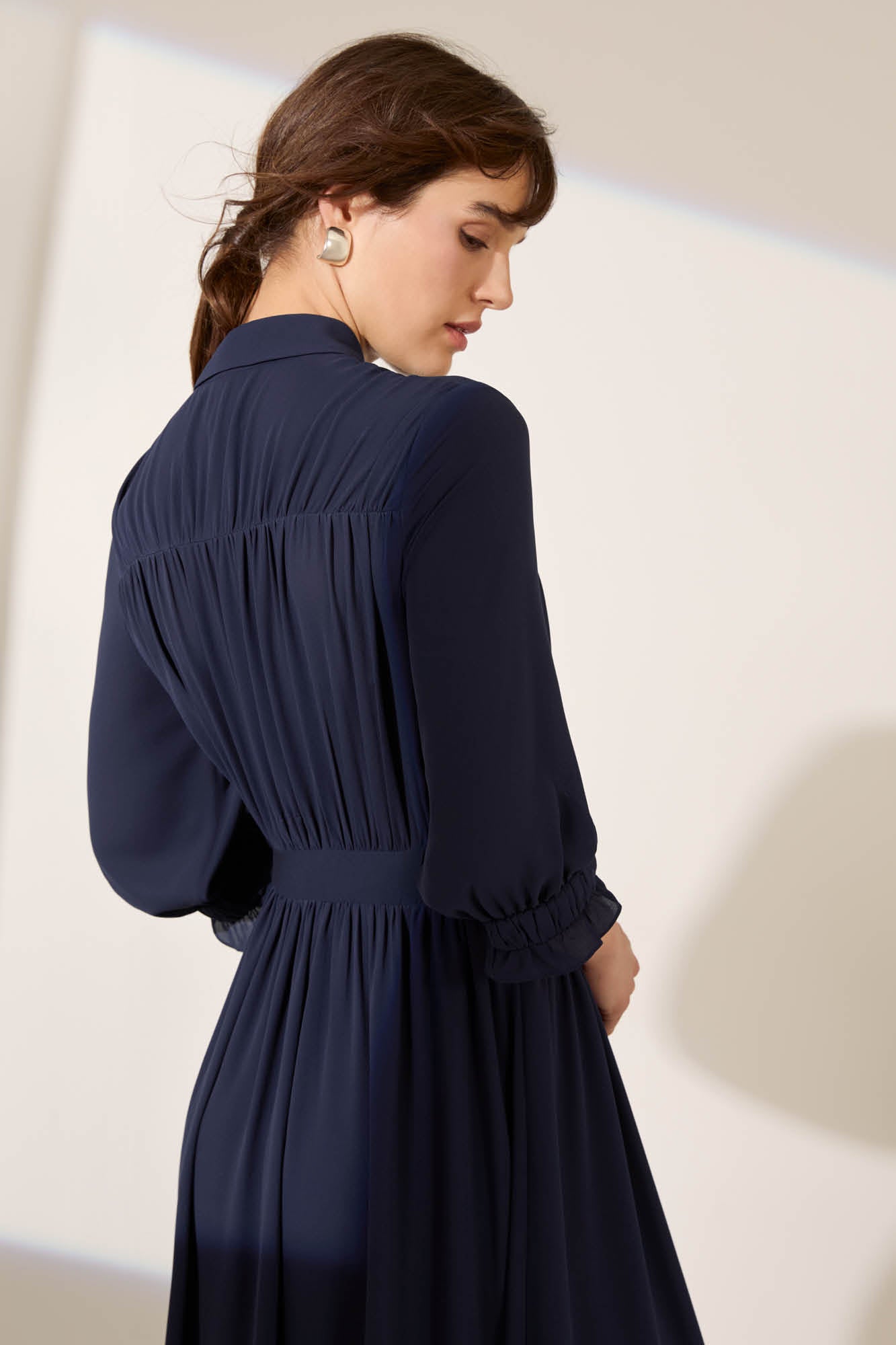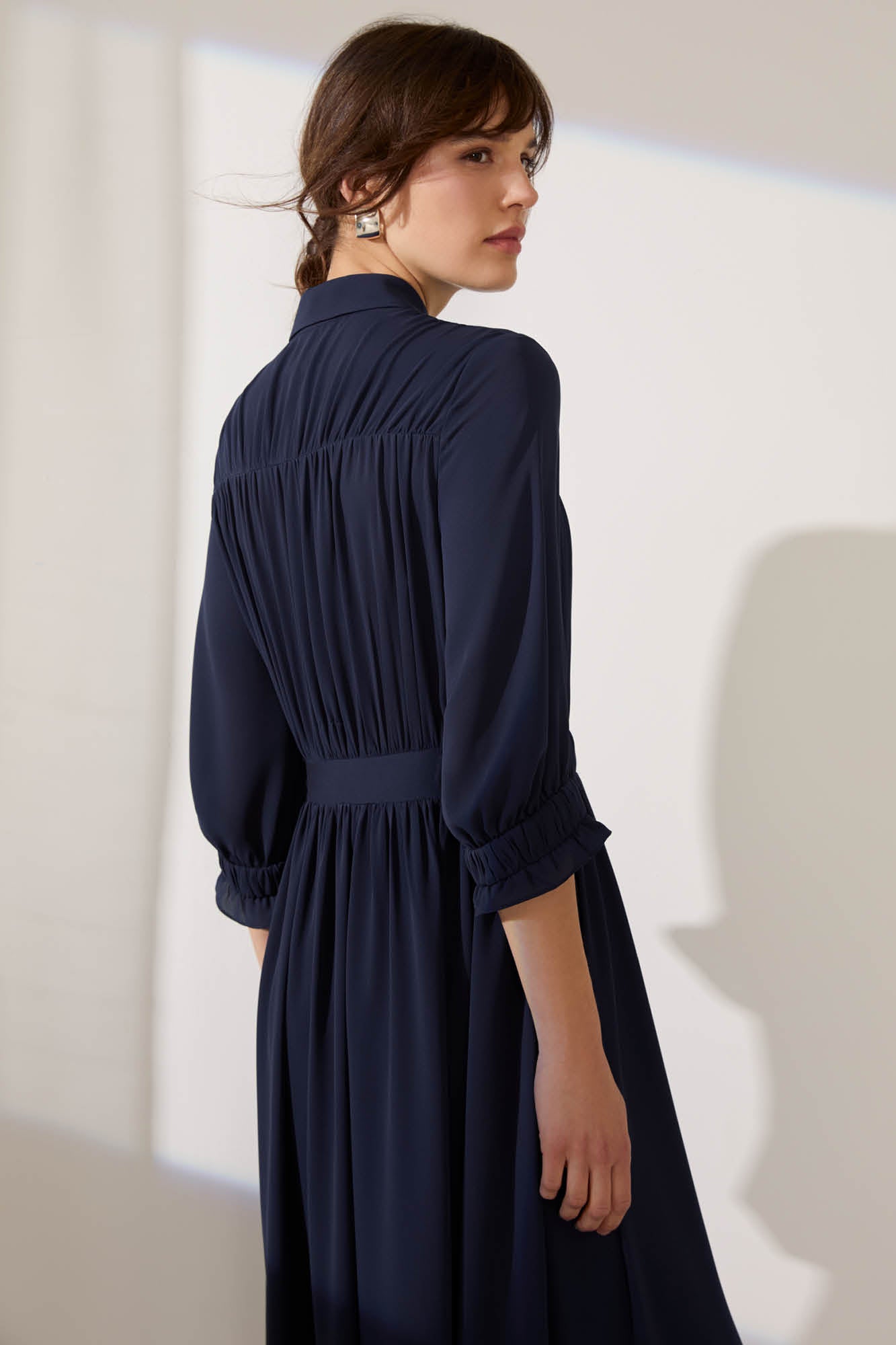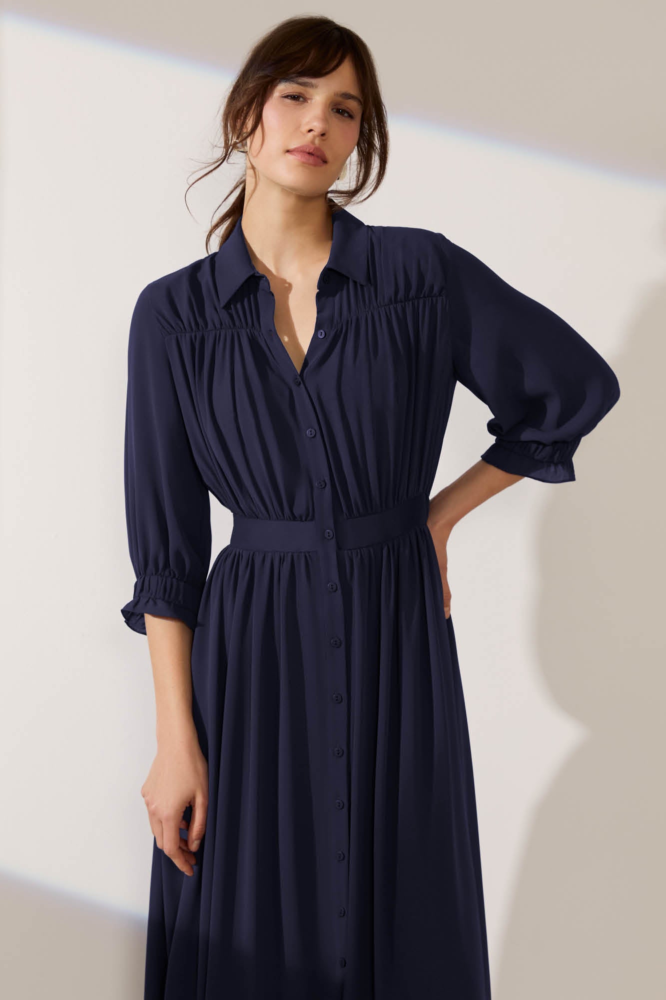 Modern femininity encapsulated in soft gathered detailing and a flowing silhouette. Casablanca is a shirt dress with a romantic feel, double-layer georgette is gathered at the shoulders to create a beautiful draped bodice. The sleeves finish just below the elbow in a cinched elastic cuff that adds a gentle volume.