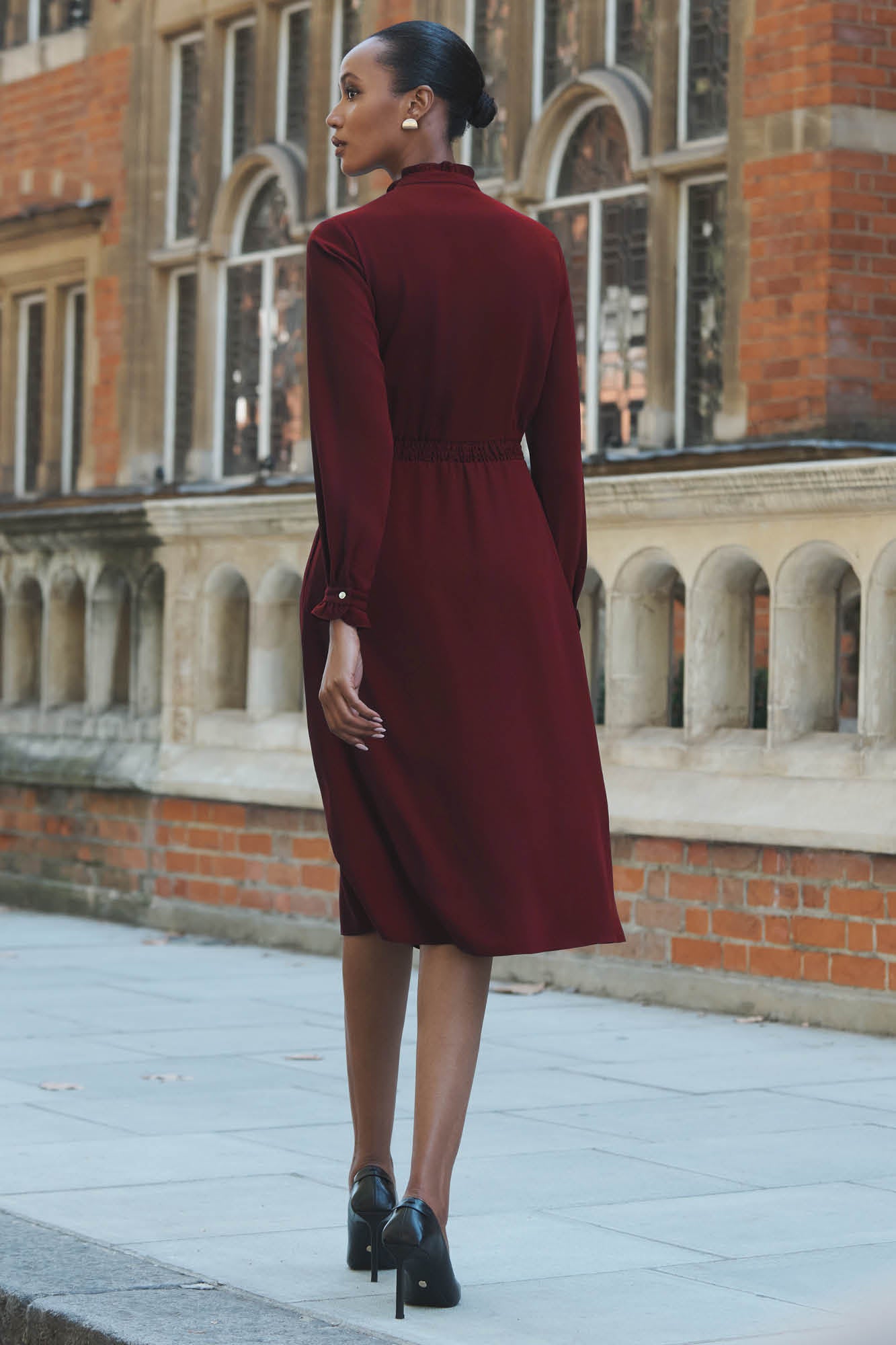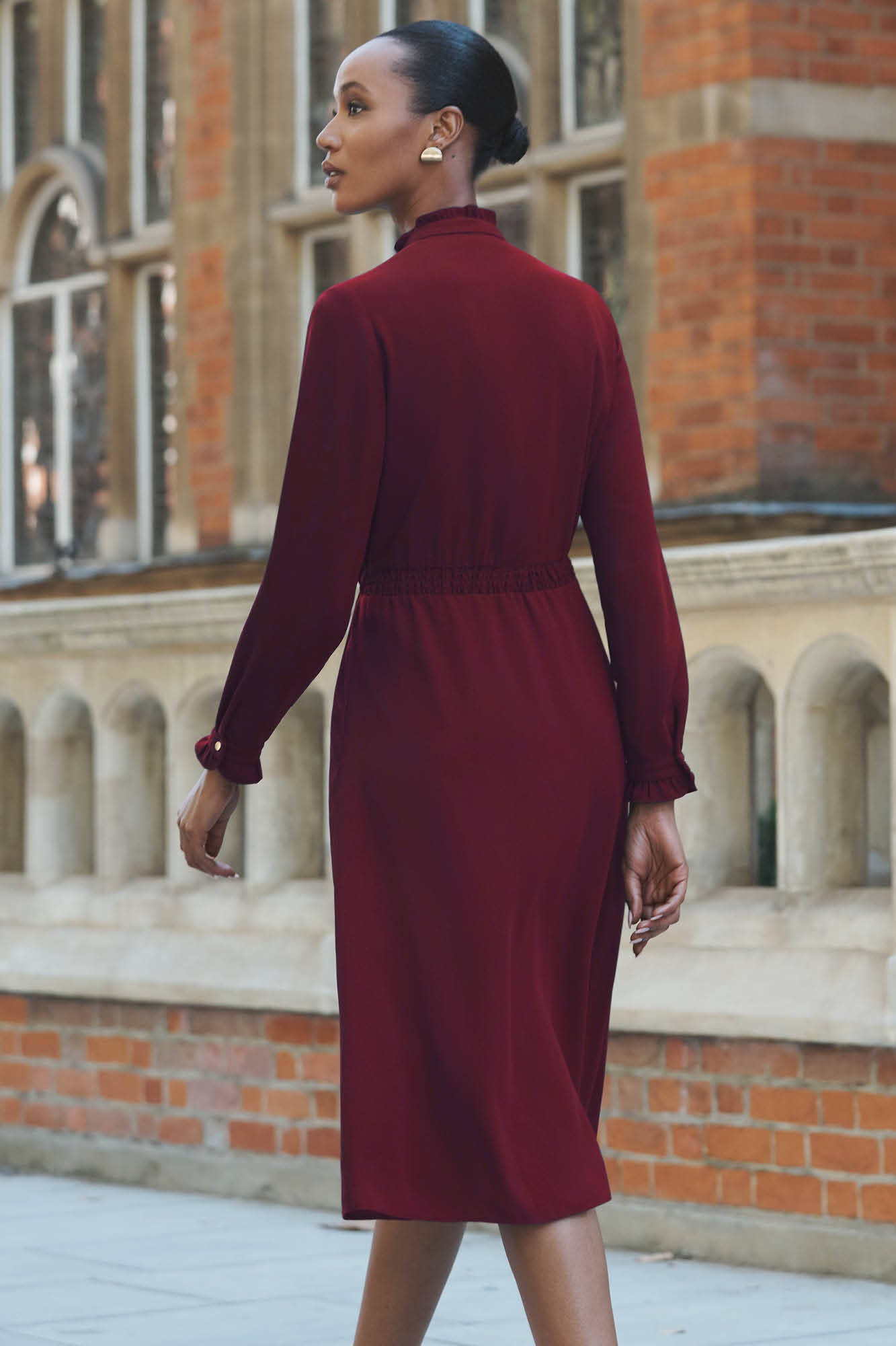 This elegant midi dress features a blouson shirt and soft skirt, elevated by its gathered back and drawstring waistband to ensure a great fit. Framed by an elegant ruffled collar and cuff detail, the dress accented by statement gold buttons down the centre front placket. And if all this wasn't enough, it has pockets.