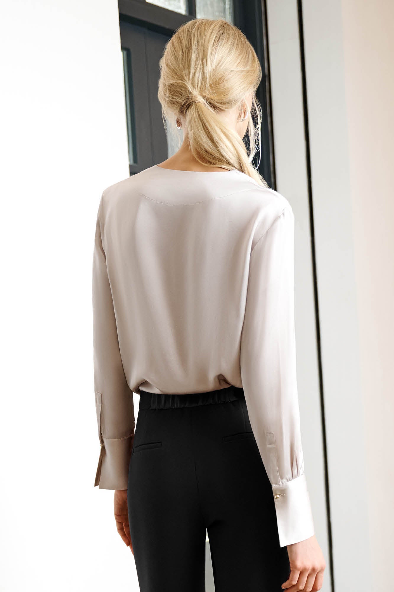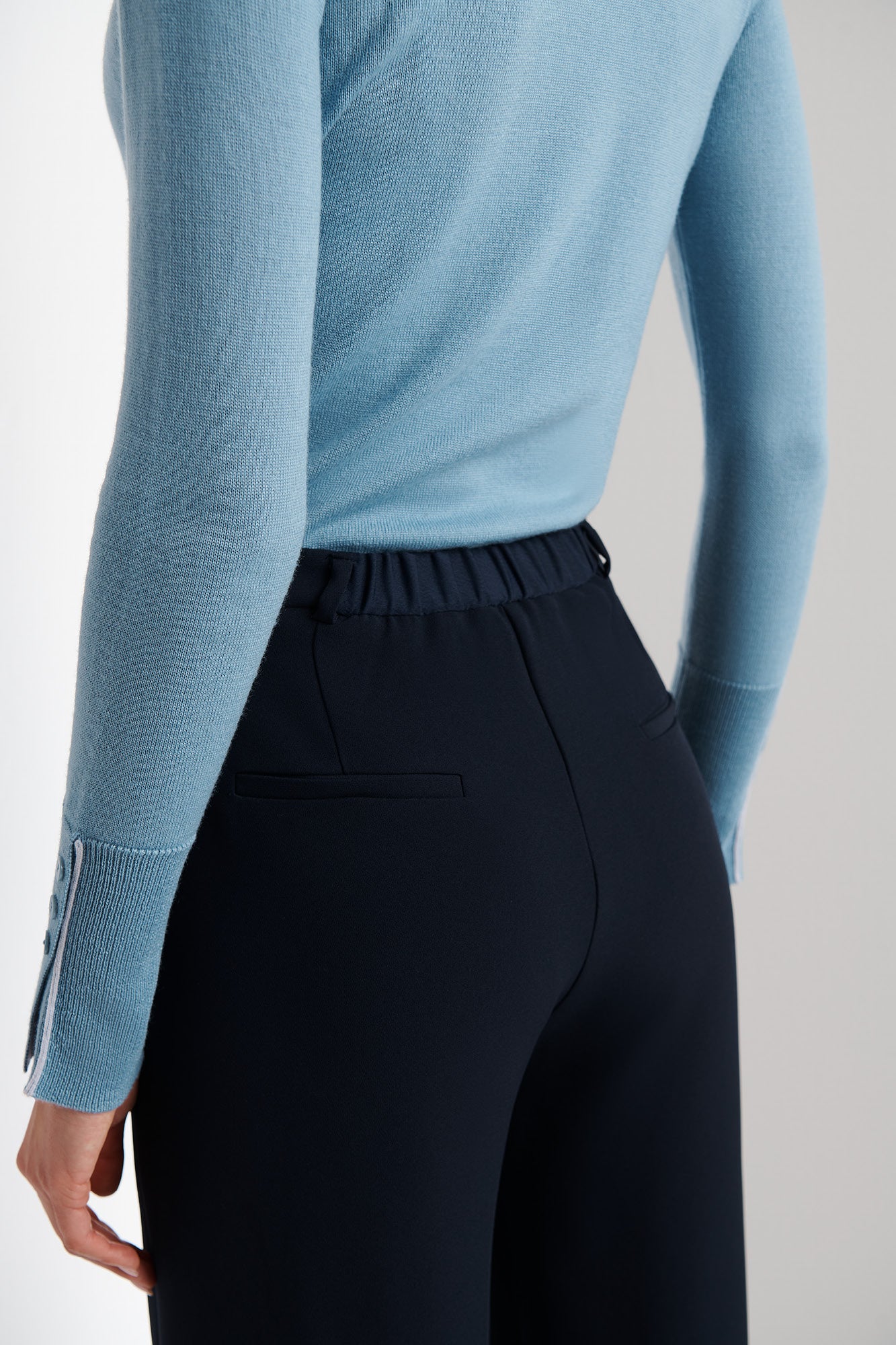 Model wears with our Brompton Jacket in Navy Performance Tailoring and our Ravello Blouse in Oyster.