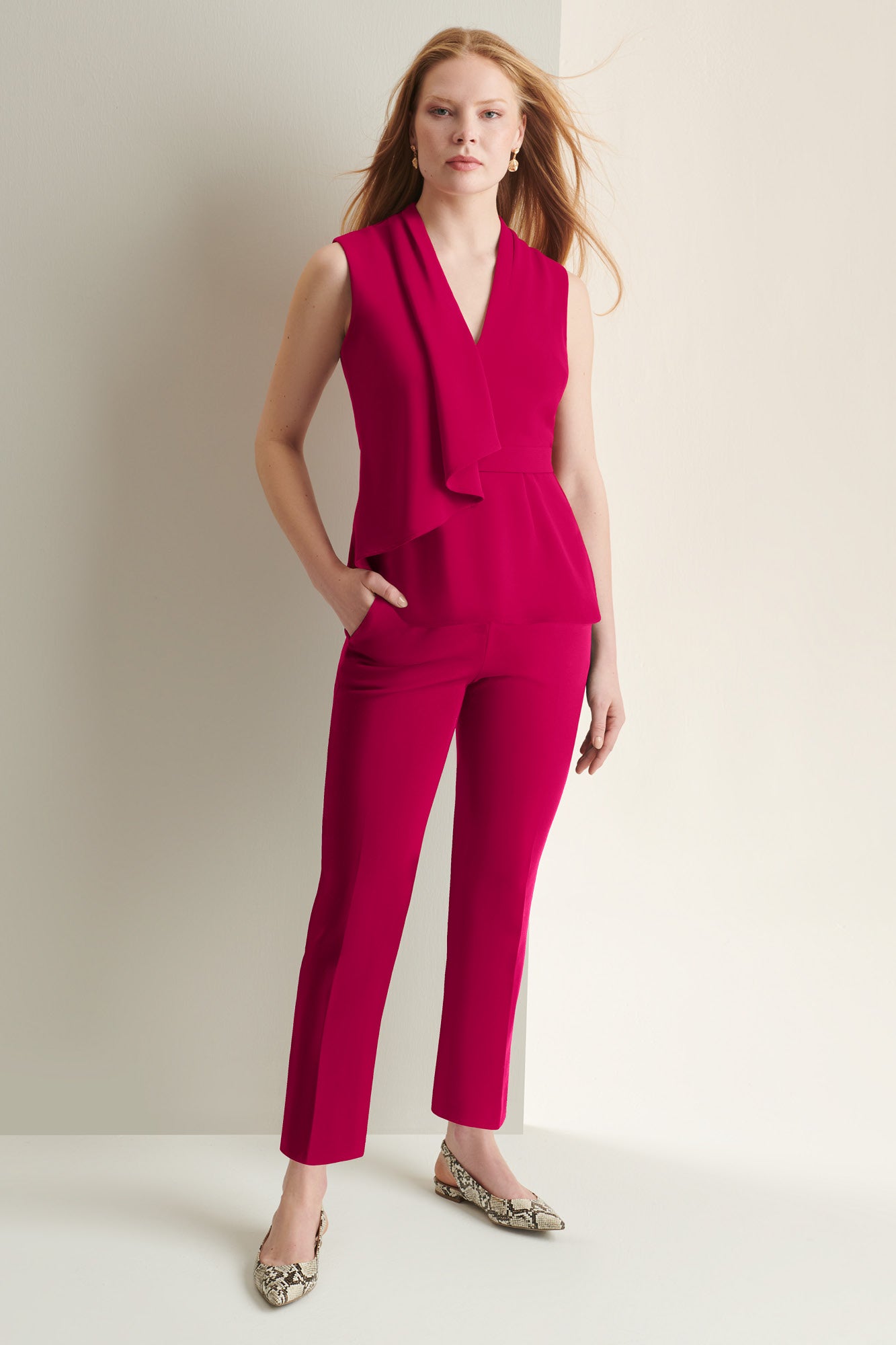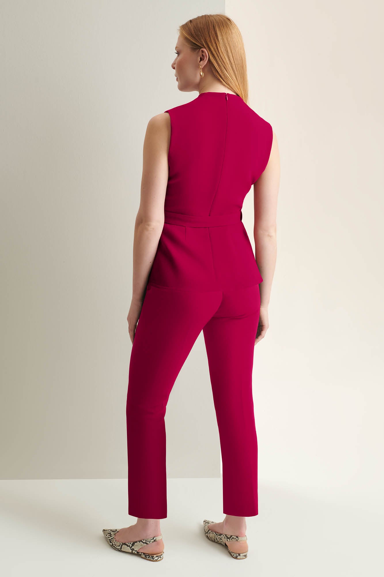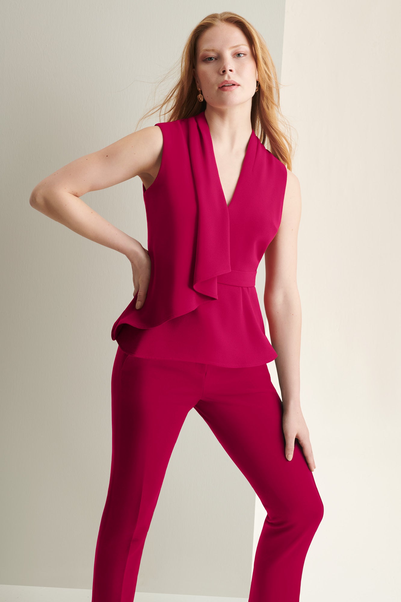 Structured shaping is combined with a softly draped waterfall front to create an elegant and figure flattering look in the Tatton top. The matching belt creates a focal point at the waist while the gentle peplum of the waist skims over your stomach. Pair it with the matching Clarence trousers for a standout coordinated look or create an elegant and lengthened silhouette with a wider legged trouser like the Harlequin.