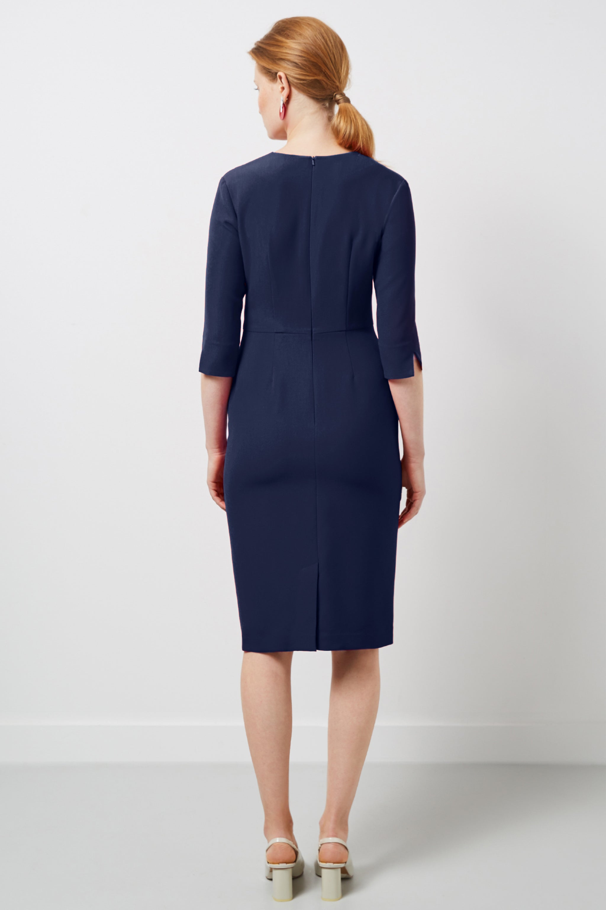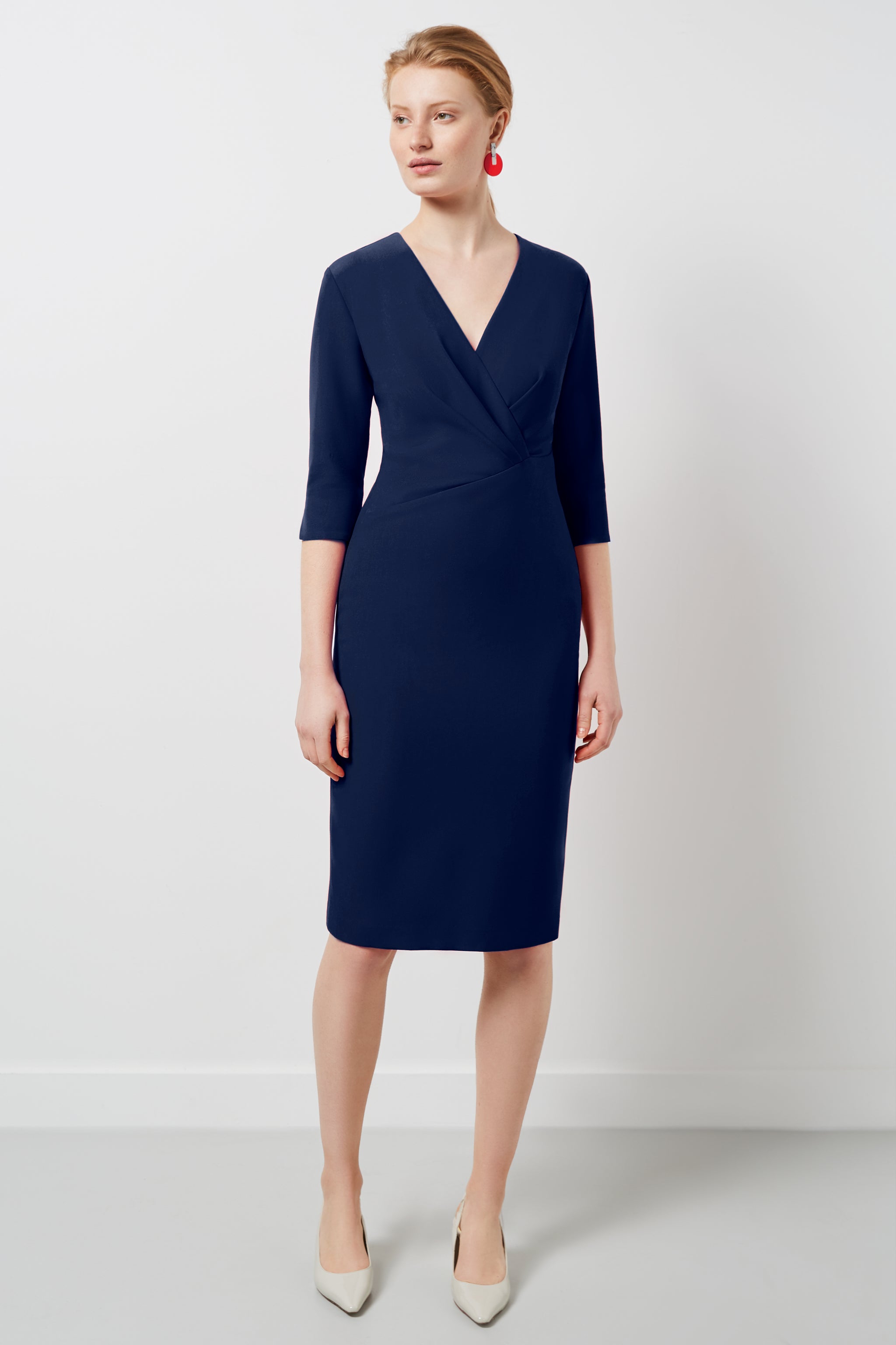 Cut with a fitted asymmetric waist Wigmore is your standout structured work dress, the type you can wear on repeat for years to come. The wrap style v-neck is pleated into the waist seam and the 3/4 length sleeves have a flattering split at the elbow, which also allows for ease of movement.